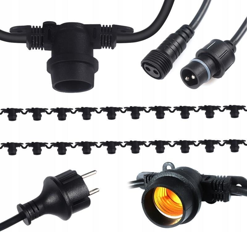 Girlandy zasilana z sieci to doskonały sposób na nadanie niezwykłego klimatu. Doskonale sprawdzą się w ogrodach, altanach lub wewnątrz budynków w jadalni, sali ślubnej czy w restauracji. Można łączyć wiele łańcuchów ze sobą maksymalnie do 200m lub 700W obciążenia. Żarówki nie należą do zestawu są na zdjęciach tylko w celach poglądowych. Girlandy żarówek niekoniecznie ledowych to doskonały sposób na nadanie niezwykłego klimatu. Doskonale sprawdzą się w ogrodach, altanach, patio lub wewnątrz budynków w jadalni, sali weselnej czy w restauracji. Zaletą tych girland sieciowych jest fakt że mogą świecić przez cały rok niezależnie od pogody, w przeciwieństwie do odpowiedników solarnych. Sznur posiada zależnie od wybranej wersji 10, 15, 20 lub 40 oprawek na żarówki z gwintem E27, odległość między oprawkami wynosi 50 lub 100cm (całość sznura 10m, 15m lub 20m). Przy każdej żarówce uchwyt do powieszenia. Kolor kabla i oprawek czarny. Żarówki na zdjęciach tylko w celach poglądowych, nie są częścią zestawu. SPECYFIKACJA : Napięcie wejściowe: AC 220-240V 50/60Hz Dopuszczalna długość w szeregu: max. 200m lub max. 700W Źródło światła: 10/15/20 lub 40 x LED E27 (zależnie od wybranej wersji) Długość całkowita: 10/15/20 [m] (zależnie od wybranej wersji) Długość kabla zasilającego: 100 [cm] Odległość pomiędzy żarówkami: 50 lub 100 [cm] (zależnie od wybranej wersji) Odległość od złącza hermetycznego do żarówki: 50 [cm] Rodzaj przewodu: H05RN-F 2x1mm Klasa odporności: IP44 Kolor: Czarny Temperatura pracy: -20°~+60°C Girlandy wyposażone są w przewód H05RN-F 2x1mm zakończony 2 pinowym złączem z każdej ze stron. Różni się on przede wszystkim jakością, w tańszych produktach przewody wytrzymują maksymalnie rok na zewnątrz, przewody H05RN-F można zostawić na zewnątrz nawet na zimę. Sznury z girlandami możemy łączyć w wiele łańcuchów ale maksymalnie 200m lub 700W obciążenia (dotyczy zasilania z sieci 230V dla 24V to już tylko 70w)