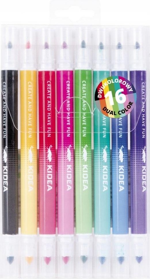 Kolorowa Przyjemność: Flamastry Dwukolorowe Kidea to idealne narzędzie dla każdego, kto pragnie tworzyć, malować i zachwycać swoją wyobraźnią! Te 16 soczystych odcieni pozwolą Ci rozwijać swoje artystyczne pasje i przenieść swoje pomysły na papier w niezwykle efektowny sposób. Każdy rysunek stanie się dziełem sztuki! Dlaczego flamastry Kidea są wyjątkowe? Oto kilka ich najlepszych cech: Dwukolorowe końcówki - pozwalają na mieszanie kolorów i cieniowanie bez potrzeby zmiany narzędzi. Intensywne barwy - każdy odcień jest pełen energii i zachwyca swoją głębią. Wodoodporne - po wyschnięciu kolory są odporne na wodę, co sprawia, że Twoje prace zachowają intensywność przez długi czas. Łatwe w użyciu - idealne zarówno dla dzieci, jak i dorosłych artystów! Z przyjemnością zapraszamy do świata kolorów i kreatywności. Twórz wspaniałe rysunki, mandale, a także doskonałe prace plastyczne na każdą okazję. Flamastry te stanowią doskonały wybór na prezent dla bliskiej osoby lub jako wyposażenie do szkolnych zajęć artystycznych. Twoje dziecko na pewno je pokocha! ? Kiedy tworzysz z Kidea, nie musisz martwić się o plamy - specjalna formuła tuszu łatwo się zmywa i nie brudzi rąk, co zapewnia czystą zabawę i radość. Dzięki innowacyjnej konstrukcji flamastry świetnie leżą w dłoni, a ich miękkie końcówki pozwalają na precyzyjne konturowanie oraz kreatywne eksperymentowanie. Nie czekaj dłużej, dołącz do grona twórczych pasjonatów i zamów swoje flamastry Kidea już dziś! Stwórz dzieła, które będą zachwycały wszystkich wokół. Przekonaj się, jak wiele radości można czerpać z kolorowania! ?