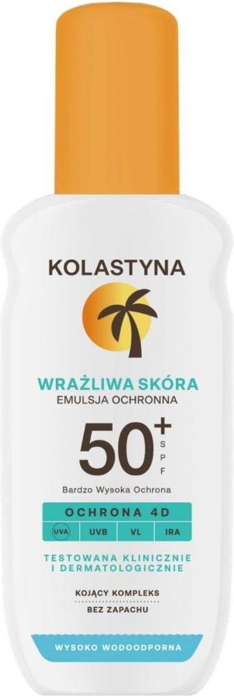Kolastyna Wrażliwa Skóra Ochronna Emulsja SPF50+ 150ml Emulsja do opalania w sprayu w wersji skóra wrażliwa SPF 50+ zapewnia optymalną ochronę przed 4 głównymi rodzajami promieniowania: UVA, UVB, VL*, IRA*odpowiedzialnymi za uszkodzenia skóry. Pomaga minimalizować prawdopodobieństwo wystąpienia reakcji alergicznych. Ultra-nawilżające połączenie kwasu hialuronowego i betainy utrzymuje skórę wrażliwą odpowiednio nawodnioną, pozostawiając przyjemne uczucie komfortu. Pojemność 150ml