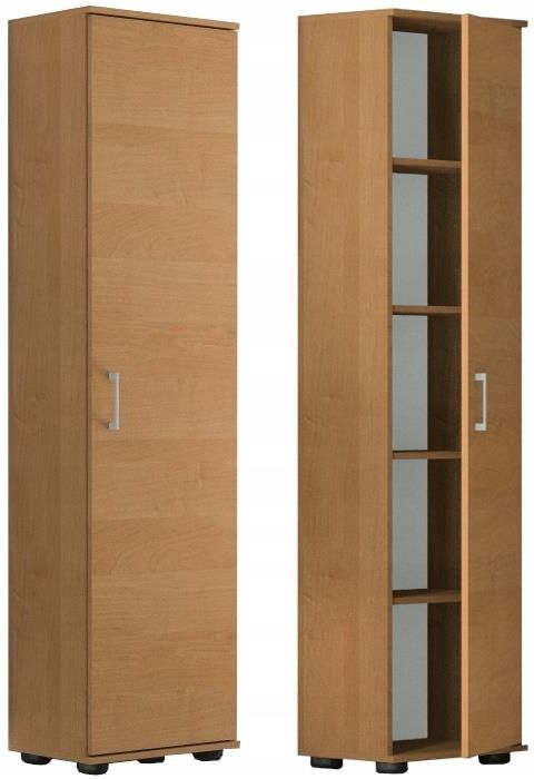 Regał biurowy do salonu, pracowni, sypialni Szafa biurowa na dokumenty i książki M 1D olcha 30 x 32 cm Regał na segregatory i książki to doskonałe rozwiązanie do biur lub pomieszczeń domowych. Klasyczny wygląd i funkcjonalność spełnią oczekiwania najbardziej wybrednych klientów. Informacje dodatkowe klasyczny wygląd pięć półek dopasowany do segregatorów biurowych podwyższona odporność na zarysowania nóżki w kolorze czarnym 3 cm korpus i front w kolorze olcha dostępne inne wersje regału M Regał do samodzielnego montażu z czytelną instrukcją. Wymiary regału szerokość 30 cm wysokość 182 cm głębokość 32 cm wysokość półek 33 cm Wnętrze regału. Regał wyposażono w drzwiczki, za którymi znajduje się pięć półek. Materiał. Korpus oraz front wykonano z płyty laminowanej producenta Kronopol o grubości 16 mm w kolorze olcha. Plecy zrobiono z płyty HDF 3 mm. Obrzeża. Krawędzie płyty są oklejone PCV odpornym na wilgoć i zarysowania.