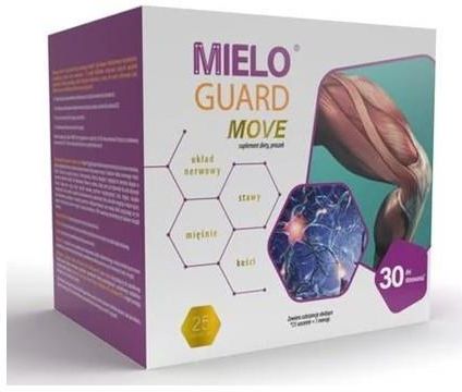 Mieloguard MovePOJEMNOŚĆ: 25 sasz.WŁAŚCIWOŚCI:Mieloguard Move to suplement diety zawierający Naticol®- rybi kolagen hydrolizowany enzymatycznie, monofosforan urydyny, kwas nerwonowy i 13 innych składników aktywnych, będących specjalnie opracowaną formułą wspierającą układ mięśniowo-szkieletowy, istotny dla ruchu i aktywnego życia.ZALECANA PORCJA DO SPOŻYCIA:1 saszetka dziennie. Zawartość saszetki wsypać do szklanki wody (ok. 100- 250 ml), wymieszać i natychmiast wypić nie czekając do całkowitego rozpuszczenia.SKŁAD:Składniki: Naticol®/ enzymatycznie hydrolizowany kolagen z ryb; maltodekstryna – substancja wypełniająca; witamina C (kwas L-askorbinowy); Magnez (tlenek magnezu); aromat truskawkowy - substancja aromatyzująca; dwutlenek krzemu/krzemiany- substancja przeciwzbrylająca; siarczan chondroityny (pochodzący z chrząstki wołowej); kwas cytrynowy- stabilizator kwasowości; monofosforan urydyny; sukraloza, glikozydy stewiolowe ze stewii –substancje słodzące; burak czerwony-barwnik; kwas hialuronowy (hialuronian sodu); ekstrakt z kłącza kurkumy (Curcuma longa L.,Rhizome); CMP (monofosforam-5 cytydyny); ekstrakt z kłącza imbiru (Zingiber officinale Roscoe, Rizhome); niacyna (amid kwasu nikotynowego); witamina B6 (chlorowodorek pirydoksyny); tiamina (witamina B1/chlorowodorek tiaminy); kwas nerwonowy; witamina D3 (cholekalcyferol); kwas foliowy (kwas pteroilomonoglutaminowy); witamina B12 (cyjanokobalamina).