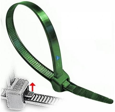 Rozpinana opaska zaciskowa / 100 szt/ Bardzo mocna,rozpinana opaska zaciskowa idealna do wiązania roślin do tyczek bambusowych. Szerokość taśmy 4,8 mm , długość 300 mm . Wysyłamy losowo kolor czarny lub zielony Opaską możemy związać, z rośliną, nawet najgrubsze tyczki.