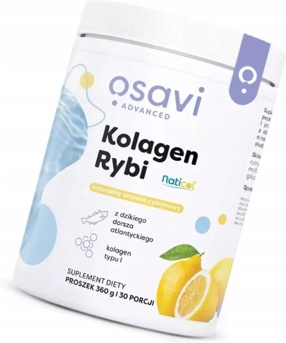 Kolagen Rybi z Dzikiego Dorsza, CYTRYNA- 360 gram Smak: cytrynowy OSAVI ADVANCED Kolagen Rybi z Dzikiego Dorsza, GREJPFRUT - 360 gram Z naturalnym aromatem Czysta etykieta (ang. clean label) - produkt nie zawiera żadnych zbędnych dodatków Miarka w środku. Doskonała rozpuszczalność. Bez glutenu, bez laktozy, bez soi, bez GMO, koszerny, halal. Produkt posiada Certyfikaty: 222401PL 2392410PL 332502PL 212401PL 1632408PL Suplement diety w formie proszku, zawierający bioaktywne peptydy kolagenowe Naticol® - starannie opracowany i przebadany klinicznie kolagen typu I, pozyskiwany z dzikiego dorsza atlantyckiego. Produkt wzbogacony o naturalne dodatki - aromat cytrynowy oraz substancję słodzącą pozyskiwaną ze stewii. Naticol® pomaga poprawić elastyczność skóry i redukuje zmarszczki Witamina C pomaga w prawidłowej produkcji kolagenu w celu zapewnienia prawidłowego funkcjonowania kości i chrząstki, skóry, zębów i dziąseł. Chcesz zadbać o odpowiednią ilość kolagenu w diecie? Zależy Ci na poprawie elastyczności skóry czy redukcji zmarszczek? A może chciałbyś wspomóc kości oraz chrząstki poprzez prawidłową produkcje kolagenu suplementując witaminę C? Wypróbuj nasz Kolagen Rybi. Kolagen to głównie białko budulcowe jednak w zależności od typu kolagenu pełni on różne funkcje, odznacza się inną budową oraz miejscem występowania. Kolagen typu I charakteryzuje się wysoką biokompatybilnością w tkance człowieka. Zalicza się do najpowszechniejszych rodzajów białka, które stanowi aż 90% ludzkiego ciała. Występuje m.in. w skórze, kościach, ścięgnach, rogówce, powięzi i torebkach narządów. Odpowiednia ilość tzw. białka młodości w organizmie wspiera wiele procesów w nim zachodzących. Kolagen Rybi od Osavi zawiera bioaktywne peptydy kolagenowe Naticol®, czyli starannie opracowany i przebadany klinicznie kolagen typu I pozyskiwany z dzikiego dorsza atlantyckiego. Badania wykazały, że Naticol® pomaga poprawić elastyczność skóry i redukuje zmarszczki. Nasz suplement diety został wzbogacony o witaminę C, która dodatkowo wspomaga produkcję kolagenu w celu zapewnienia prawidłowego funkcjonowania kości i chrząstki, skóry, zębów i dziąseł. Kolagen Rybi z dzikiego dorsza atlantyckiego ma postać proszku, nie zawiera zbędnych dodatków (posiada tzw. czystą etykietę) i charakteryzuje się doskonałą rozpuszczalnością. Dostępny jest w dwóch wariantach smakowych: z naturalnym aromatem cytrynowym lub z grejpfrutowym. Produkt wzbogacony jest o naturalną substancję słodzącą pozyskiwaną ze stewii. Dzięki miarce umieszczonej w środku z łatwością odmierzysz dzienną porcję (12 g), w której znajduje się 10 000 mg bioaktywnych peptydów kolagenowych Naticol® i aż 250 mg witaminy C. Całe opakowanie (360 g) wystarcza na miesiąc suplementacji. Skład Zawartość składników aktywnych w porcji dziennej - 1 porcja: 12g Wartość odżywcza: 1 miarki Wartość energetyczna: 186 kJ / 44 kcal Tłuszcz: 0 g - w tym kwasy tłuszczowe nasycone: 0 g Węglowodany: 0,8 g - w tym cukry: 0,1 g Błonnik: 0,1 g Białko: 9,5 g Sól: 0,08 g ---------------------------------------------------------------------------------------------------- Naticol® bioaktywne peptydy kolagenowe: 10 000 mg† Witamina C (kwas L-askorbinowy): 250 mg (313 %) ---------------------------------------------------------------------------------------------------- *RWS - dzienne Referencyjne Wartości Spożycia witamin i składników mineralnych dla przeciętnej osoby dorosłej (8400 kJ/2000 kcal)* Składniki, gramatura oraz wartości odżywcze mogą się nieznacznie różnić w zależności od wariantu smakowego produktu. †Nie ustalono wartości dziennego spożycia. Zalecana porcja do spożycia w ciągu dnia: 1 miarka (12 g) dziennie. Sposób użycia : Rozpuść 1 miarkę proszku w 200 ml wody. Sugerujemy przyjmować produkt rano Suplement diety nie może być stosowany jako substytut (zamiennik) zróżnicowanej diety. Nie należy przekraczać zalecanej porcji do spożycia w ciągu dnia! Składniki:Rybie peptydy kolagenowe, naturalny aromat grejpfrutowy, regulator kwasowości: kwas cytrynowy, maltodekstryna, kwas L-askorbinowy, substancja słodząca: glikozydy stewiolowe ze stewii Wyprodukowano w zakładzie wykorzystującym składniki pochodzące z mleka, jaj, soi, orzechów, orzeszków ziemnych (arachidowych), zbóż zawierających gluten, ryb, skorupiaków, mięczaków. Suplement diety w formie proszku. Zawartość opakowania 360 g /30 porcji Przechowywanie Przechowywać szczelnie zamknięte, w suchym miejscu, w temperaturze pokojowej do 25°C Chronić przed bezpośrednimi źródłami ciepła, promieniami słonecznymi oraz wilgocią! Przechowywać w sposób niedostępny dla małych dzieci. Najlepiej spożyć przed końcem: data i nr partii produkcyjnej znajduje się na boku/spodzie opakowania. Dystrybutor / Podmiot odpowiedzialny Olivit Sp. z o.o. ul. Blacharska 1161-006 Poznań Polska Marka: Osavi Ważne Produkt zawiera substancję słodzącą (glikozydy stewiolowe). Nie należy przekraczać zalecanej dziennej porcji. Suplement diety nie może być stosowany jako substytut (zamiennik) zróżnicowanej diety. Dla utrzymania prawidłowego stanu zdrowia należy stosować zróżnicowaną dietę i prowadzić zdrowy tryb życia. Zapis nad datą ważności: Przechowywać w ciemnym i suchym miejscu w temperaturze pokojowej, w sposób niedostępny dla małych dzieci. Przechowywać w miejscu niedostępnym dla dzieci. Przechowywać w chłodnym, suchym miejscu. Nie używać, jeśli plomba zabezpieczająca jest uszkodzona lub w przypadku jej braku. Suplement diety. Nie należy przekraczać zalecanej porcji do spożycia w ciągu dnia. Produkt nie może być stosowany jako substytut zróżnicowanej diety. Zrównoważony sposób żywienia oraz zdrowy tryb życia są podstawą prawidłowego funkcjonowania organizmu. Skonsultuj się z lekarzem, jeśli jesteś w ci