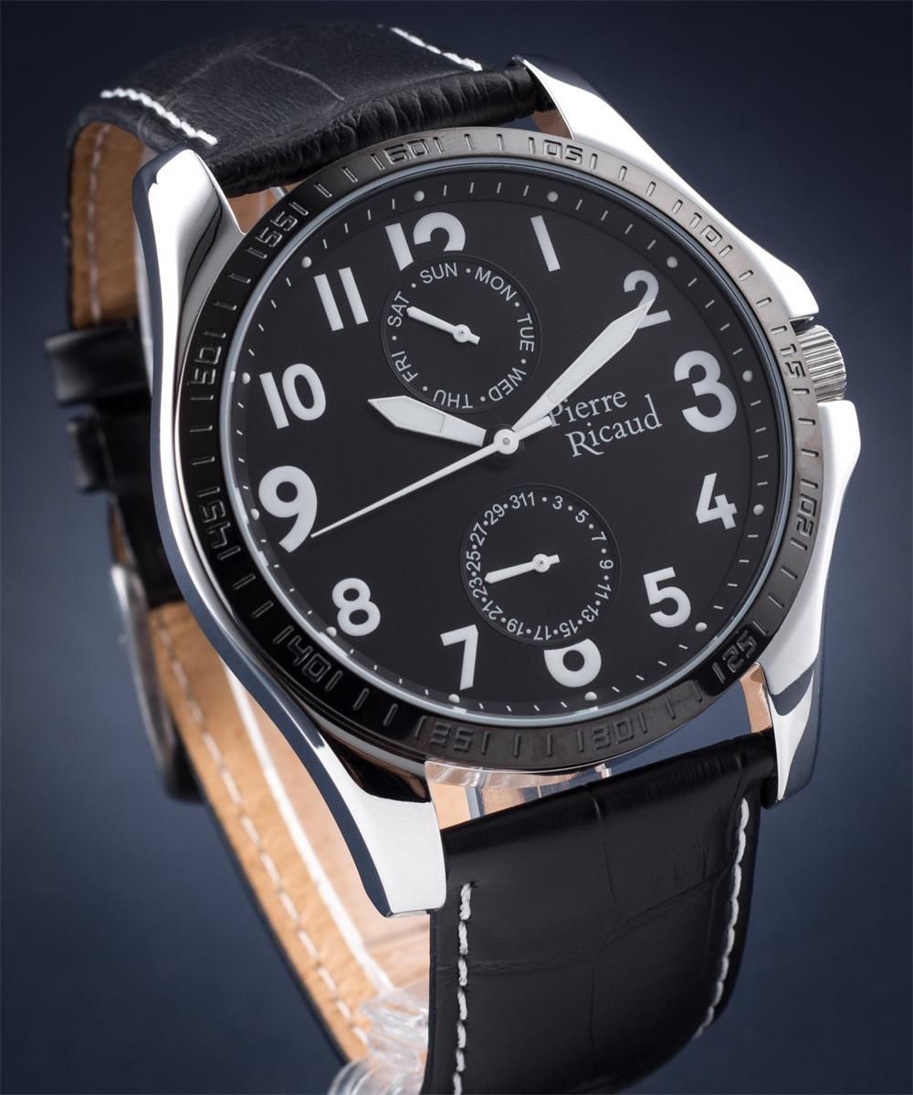 Elegancki zegarek męski renomowanej szwajcarskiej marki Pierre Ricaud - P91071.Y224QF Model P91071.Y224QF posiada kwarcowy mechanizm Seiko Epson VX7P Swiss Made zasilany baterią, dzięki czemu wskazanie czasu jest bardzo dokładne - granica błędu tego typu mechanizmów wynosi zaledwie 10 sekund w skali miesiąca, a bateria wystarcza średnio na 2 lata użytkowania. Zegarek firmy Pierre Ricaud P91071.Y224QF to uniwersalny czasomierz pasujący na każdą rękę. Koperta wykonana ze stali szlachetnej. Szeroki pasek skórzany jest sam w sobie elegancka ozdobą. Szkło mineralne nakrywa owalną czarną tarczę zegarową z cyframi arabskimi. Model wyposażono w datownik wskazujący dzień miesiąca oraz dzień tygodnia. Klasa wodoszczelności tego modelu to 50 M (5 ATM) co oznacza, że zegarek jest wodoszczelny, można go przypadkowo zamoczyć ale nie zaleca się jednak w nim pływać z uwagi na działające wówczas ciśnienie dynamiczne. Wymiary: Szerokość koperty 45 mm Grubość koperty 10 mm Waga 75 g Zegarek wysyłamy w oryginalnym, eleganckim opakowaniu (twarde pudełko wraz z ozdobną, papierową torebką) z dołączoną gwarancją oraz dowodem zakupu. Wszystkie oferowane przez nas zegarki pochodzą z oficjalnej, polskiej dystrybucji. Posiadają oryginalne opakowania, kartę gwarancyjną ważną na terenie całej Polski oraz Unii Europejskiej oraz instrukcję obsługi w języku polskim i angielskim