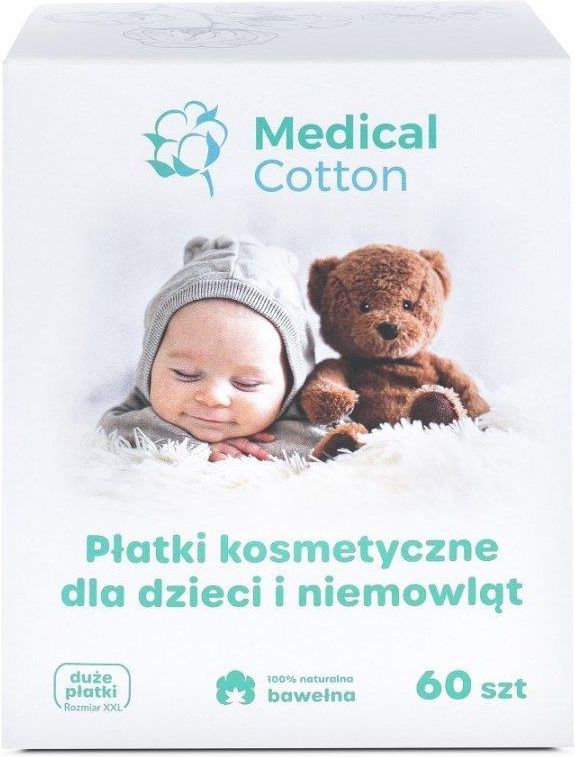 Charakterystyka Odkryj najwyższą jakość pielęgnacji dla swojego maluszka z płatkami kosmetycznymi Medical Cotton. Płatki zostały stworzone z myślą o delikatnej skórze niemowląt, a dzięki wykonaniu ze 100% bawełny zapewniają bezpieczeństwo i komfort w codziennej pielęgnacji. Mogą być używane już od 1 dnia życia. Duże płatki w rozmiarze XXL doskonale chłoną wilgoć, co sprawia, że idealnie nadają się do różnych zastosowań pielęgnacyjnych. Bez dodatku sztucznych barwników i zapachów, co minimalizuje ryzyko podrażnień i alergii. Płatki można używać na sucho oraz w połączeniu z wodą lub oliwką dla dzieci. Zastosowanie płatków higienicznych Medical Cotton 100% naturalnej bawełny: Idealne do codziennego przemywania twarzy i ciała niemowlęcia. Miękka struktura płatków zapewnia delikatne, a zarazem skuteczne oczyszczanie skóry. Niezastąpione podczas zmiany pieluszki. Doskonale nadają się do przemywania wrażliwych obszarów skóry, ścierając resztki kremów i innych zabrudzeń. Ułatwiają aplikację balsamów, oliwek, czy kremów ochronnych. Delikatne płatki umożliwiają równomierne rozprowadzenie kosmetyków, zapewniając skórze dziecka odpowiednią pielęgnację. Bezpieczne do delikatnego oczyszczania oczu i uszu niemowlęcia, dzięki swojej miękkości i hipoalergicznym właściwościom. Sposób użycia: Delikatnie namocz płatek letnią wodą i przetrzyj nim skórę dziecka. Płatki kosmetyczne mogą być używane również do pielęgnacji z wykorzystaniem odpowiedniego kosmetyku do oczyszczania skóry.
