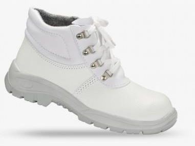 Trzewiki zawodowe bez podnoska - model 03 Wierzch obuwia wykonany z licowych skór bydlęcych białych Górna część cholewki zakończona przyjaznym dla nogi kołnierzem ochronnym, wypełnionym pianką lateksową Podszewka przyszwy – włóknina Ibiline, podszewka obłożyny z włókniny Super Royal materiału o dużej przepuszczalności pary wodnej. Podeszwa z dwuwarstwowego poliuretanu odpornego na oleje, smary, benzynę i inne rozpuszczalniki organiczne (na styku z podłożem chroniąca przed poślizgiem warstwa litego poliuretanu, charakteryzującego się dużą odpornością na ścieranie, pękanie i przecinanie; warstwa wewnętrzna poliuretanu spienionego, sprawia natomiast, że obuwie jest lekkie, elastyczne i skutecznie łagodzi nierówności podłoża). Forma podeszwy i głęboki protektor gwarantuje jej wysoką stabilność Odporne na temperaturę w krótkotrwałym kontakcie do 180°C Doskonale chroni piętę, a specjalnie wyprofilowany obcas dodatkowo chroni nogę przed skręceniem Pochłania energię w części piętowej – dwustopniowy Shockabsorber Zastosowana technologia łączenia podeszwy z cholewką – bezpośredni, dwustopniowy wtrysk poliuretanu zapewnia trwałość połączenia spodu z wierzchem i nieprzemakalność obuwia od podłoża. Paraboliczny obcas gwarantuje stabilność i komfort chodzenia Wyposażone w wyjmowaną higroskopijną wyściółkę, posiadającą właściwości przeciwpotne Bez podnoska Antyelektrostatyczne Szczególnie zalecane dla przemysłu spożywczego Obuwie produkowane jest w numeracji francuskiej w rozmiarach od 36 do 48 Tęgość - H 1/2 NORMY I CECHY PN-EN ISO 20347, O1, FO, SRC