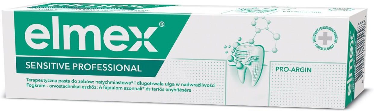 elmex SENSITIVE PROFESSIONAL - Terapeutyczna pasta do zębów: natychmiastowa* i długotrwała ulga w nadwrażliwości Co to jest nadwrażliwość zębów? Wrażliwość zębów to częsta dolegliwość, która dotyczy ponad połowy dorosłej populacji. Cofanie się dziąseł oraz uszkodzenia szkliwa powodują odsłonięcie tysięcy mikroskopijnej wielkości kanalików z zakończeniami nerwowymi. To właśnie otwarte kanaliki zębinowe są przyczyną bólu występującego w nadwrażliwości zębów. Wszelkie bodźce spowodowane przez kontakt z zimnym, gorącym lub słodkim są przewodzone przez zakończenia nerwowe w kanalikach zębinowych bezpośrednio do nerwów. Odczuwamy to jako przeszywający, ostry i krótkotrwały ból zęba. Można go zlikwidować stosując odpowiednią pastę̨ do zębów.  Sięgnij po pastę elmex SENSITIVE PROFESSIONAL z technologią PRO-ARGIN i poczuj natychmiastową* ulgę w nadwrażliwości zębów!  Zatrzymaj ból wrażliwych zębów i ciesz się̨ życiem bez ograniczeń Pasta do zębów elmex SENSITIVE PROFESSIONAL zapewnia natychmiastowe* i długotrwałe zniesienie bólu spowodowanego nadwrażliwością̨ zębiny - od pierwszego użycia. Wyjątkowa receptura PRO-ARGIN z technologią używaną przez stomatologów do znoszenia nadwrażliwości zębiny u pacjentów zamyka kanaliki zębinowe, w których są zakończenia nerwów, dzięki czemu blokuje ból. Przy regularnym użyciu pasta elmex SENSITIVE PROFESSIONAL buduje długotrwałą barierę ochronną przeciw nadwrażliwości. elmex to najczęściej polecana przez dentystów na nadwrażliwość pasta do zębów w Polsce!** Zapytaj swojego stomatologa lub higienistki.  Jak działa terapeutyczna pasta elmex SENSITIVE PROFESSIONAL z systemem PRO-ARGIN? Technologia PRO-ARGIN sprawia, że pasta do zębów elmex SENSITIVE PROFESSIONAL zapewnia klinicznie potwierdzoną ulgę w bólu spowodowanym nadwrażliwością zębiny, uszczelniając i zamykając otwarte kanaliki zębinowe. NATYCHMIASTOWE ZNIESIENIE NADWRAŻLIWOŚCI Technologia PRO-ARGIN oparta jest na argininie, aminokwasie naturalnie obecnym w ślinie oraz na węglanie wapnia. W wyniku działania pasty bogata w wapń warstwa zamyka i uszczelnia otwarte kanaliki zębinowe w rejonie szyjki zęba, natychmiast likwidując ból.  Dla natychmiastowego zniesienia nadwrażliwości* nałóż pastę̨ na powierzchnię nadwrażliwego zęba opuszką palca i delikatnie wmasuj przez minutę. W badaniach klinicznych technologia PRO-ARGIN przyniosła natychmiastową ulgę w bólu spowodowanym nadwrażliwością aż o 60%*** w porównaniu do stanu przed zastosowaniem produktu!  DŁUGOTRWAŁE ZNIESIENIE DOLEGLIWOŚCI BÓLOWYCH Przy regularnym stosowaniu pasta buduje długotrwałą barierę ochronną przeciw nadwrażliwości. Warstwa, która uszczelnia kanaliki zębinowe nie ulega zniszczeniu, nawet po narażeniu na kwasy i jest odbudowywana z każdym użyciem pasty elmex SENSITIVE PROFESSIONAL, zapewniając długotrwałe zniesienie dolegliwości bólowych.** Dla trwałego efektu szczotkuj zęby pastą elmex SENSITIVE PROFESSIONAL dwa razy dziennie miękką szczoteczką. Znacząca długotrwała ulga w bólu spowodowanym nadwrażliwością to aż 80%**** już po 8 tygodniach stosowania w porównaniu do stanu przed zastosowaniem produktu!  Jak zapobiegać wystąpieniu nadwrażliwości i jak sobie z nią̨ radzić́?  ● Rozpoczynaj czyszczenie zębów zawsze od miejsc niewrażliwych, a kończ w najbardziej wrażliwych. Skonsultuj ze swoim dentystą technikę̨ szczotkowania odpowiednią do twoich potrzeb. Nie używaj past o dużej ścieralności. Nie wybielaj zębów.  ● Unikaj jedzenia bardzo zimnych potraw i słodyczy. Nie szczotkuj zębów zaraz po zjedzeniu pokarmów zawierających kwasy. W takiej sytuacji wypłucz jamę̨ ustną np. wodą lub płukanką z fluorem albo odczekaj co najmniej godzinę̨ i dopiero wtedy wyszczotkuj zęby.  ● Używaj past, płukanek i szczoteczek przeznaczonych do zębów wrażliwych, takich jak produkty elmex SENSITIVE PROFESSIONAL i elmex SENSITIVE.  ● Używaj płukanek zawierających związki fluoru, które sprzyjają remineralizacji szkliwa i zębiny. Możesz także stosować żele lub lakiery z fluorem.  ● Przed zastosowaniem zabiegów profesjonalnych u dentysty stosuj pastę dla zębów wrażliwych przez około 2 do 3 tygodni. Kontrolne wizyty u dentysty są niezwykle ważne, ponieważ jeden dokuczliwy ząb może być dopiero początkiem problemów w jamie ustnej. Jeśli potrzebujesz dowiedzieć się więcej na temat wrażliwych zębów - zapytaj swojego dentystę.  elmex zmienia się dla Ciebie Produkty elmex przechodzą właśnie zmianę szaty graficznej. Oznacza to, że zamówiony przez Ciebie produkt elmex zostanie dostarczone w jednym z dwóch prezentowanych opakowań. Zawartość i właściwości każdego z nich są takie same. Wybierz elmex. Wybierz pewność. Wypróbuj też inne produkty elmex dopasowane do Twoich potrzeb elmex® to jedna z najbardziej znanych marek w kategorii higieny jamy ustnej w Europie. Stworzona w Szwajcarii, od 1948 roku promuje profilaktykę stomatologiczną, oferując szeroką gamę produktów o klinicznie potwierdzonej skuteczności.  Poszczególne produkty elmex, zwłaszcza stosowanie łącznie, zapewniają skuteczną ochronę przed próchnicą oraz innymi problemami jamy ustnej: ● pasty do zębów ● szczoteczki do zębów ● płyny do płukania jamy ustnej ● nici dentystyczne SKŁADNIKI: Calcium Carbonate, Aqua, Sorbitol, Bicarbonate, Sodium Lauryl Sulfate, Sodium Monofluorophosphate (1450 ppm F¯), Aroma, Cellulose Gum, Sodium Bicarbonate, Tetrasodium Pyrophosphate, Titanium Dioxide, Benzyl Alcohol, Sodium Saccharin, Xantan Gum, Limonene, Zawiera: monofluorofosforan sodu (1450 ppm F¯), Substancja czynna: Arginina 8% SPOSÓB UŻYCIA:  Dla uzyskania natychmiastowej ulgi pastę nakładać na powierzchnię nadwrażliwego zęba opuszką palca i delikatnie wmasowywać przez 1