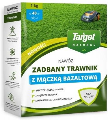 NAWÓZ ZADBANY TRAWNIK Z MĄCZKĄ BAZALTOWĄ 1KG NA 40 M2 - TARGET Nawóz Zadbany Trawnik do trawnika z mączką bazaltową Target Natural został stworzony z uwzględnieniem specyficznych wymagań nawozowych trawnika i dostarcza mu niezbędne pierwiastki do optymalnego wzrostu i rozwoju. Mączka bazaltowa zawarta w nawozie wzbogaca go o liczne mikroskładniki oraz krzemionkę, która wpływa pozytywnie na odporność trawnika i jego zdolności regeneracyjne. Połączenie tradycyjnego nawozu oraz naturalnej skały bazaltowej gwarantuje kompleksowe odżywienie i doskonałą kondycję przez cały rok. Nawóz z mączką bazaltową, której w składzie jest aż 25% to obecnie jedyny tego typu produkt dostępny na polskim rynku. Został stworzony z myślą o ogrodnikach amatorach, którzy z pasją i zaangażowaniem chcą dbać o swój ogród. Dedykowany nawóz do trawnika Zadbany Trawnik z mączką bazaltową jest łatwo przyswajalny przez korzenie traw. Formuła ta zapewnia murawie stały dostęp do składników odżywczych przez cały sezon wegetacyjny. Dzięki temu trawnik może dobrze rosnąć i zagęszczać się. Stosowanie nawozu zgodnie z zaleceniami nie niesie za sobą ryzyka wypalenia czy przenawożenia. Dawkowanie nawozu Zadbany Trawnik do trawinka z mączką bazaltową: Zakładanie trawnika 40 g / m2 przed siewem, wiosną lub późnym latem, wymieszać z glebą do głębokości 15 cm Na istniejący trawnik 25 g / m2 rozprowadzić równomiernie, stosować co 4 tygodnie, max 6 razy w sezonie Skosić trawnik przed, aby granulki mogły dostać się jak najbliżej gleby i nie przyklejały się do źdźbeł. Podlać trawnik po aby uaktywnić substancje zawarte w nawozie. Skład nawozu: azot całkowity (N) min. 5,5%, azot amonowy (N) min. 5,5%, P2O5 rozpuszczalny w kwasach mineralnych min. 3,0%, P2O5 rozpuszczalny w obojętnym cytrynianie amonu i w wodzie min. 2,5%, K2O min. 3,0%. Opakowanie: 1 kg na 40 m2