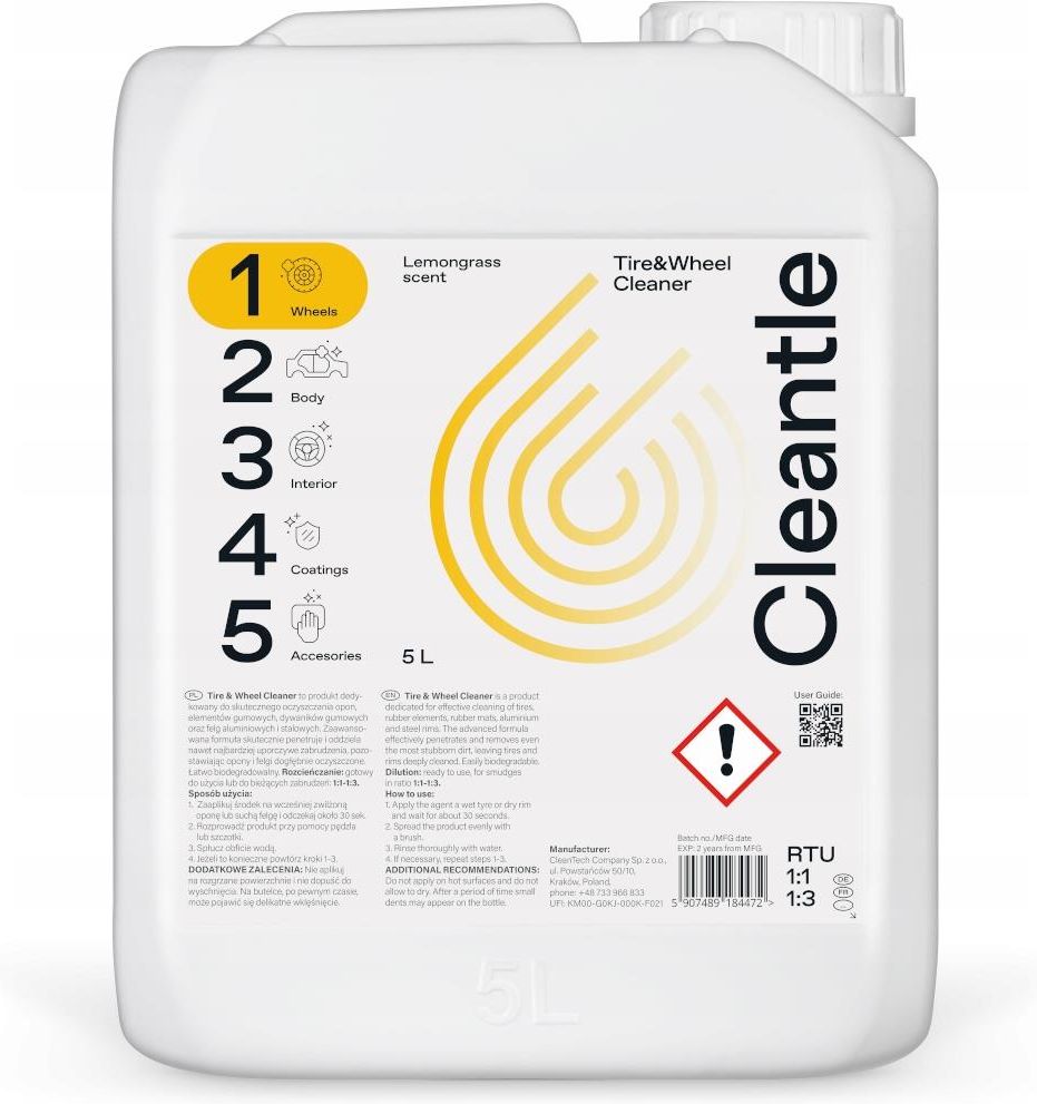Cleantle Tire & Wheel Cleaner 5L skuteczny płyn do czyszczenia opon i felg Profesjonalny środek do czyszczenia opon i felg o zapachu trawy cytrynowej ? Skutecznie usuwa zabrudzenia Bez SLES i SLS Bezpieczny dla powierzchni i środowiska Cleantle Tire & Wheel Cleaner – moc czyszczenia, która nie szkodzi Poznaj Tire & Wheel Cleaner 5L – skuteczny, biodegradowalny preparat stworzony do czyszczenia opon, felg oraz powierzchni gumowych. Dzięki złożonej formule wnika głęboko w zabrudzenia, rozpuszczając nawet najbardziej uporczywy brud drogowy i osady z klocków hamulcowych. Produkt jest pozbawiony wodorotlenku sodu, SLES i SLS, dzięki czemu jest bezpieczny dla czyszczonych elementów i środowiska. Tworzy aktywną pianę, która ułatwia kontrolę pracy i dokładne usunięcie zabrudzeń. Naturalny zapach trawy cytrynowej (lemongrass) sprawia, że czyszczenie staje się przyjemne i świeże. Idealny dla profesjonalistów i pasjonatów detailingu. Zalety produktu ✅ Wysoka skuteczność czyszczenia opon, felg i gumy ✅ Bez wodorotlenku sodu – pełne bezpieczeństwo powierzchni ✅ Bez SLES i SLS – łagodny dla środowiska ✅ Aktywna piana pokazuje, gdzie produkt działa ✅ Łatwe i szybkie spłukiwanie ✅ Biodegradowalna formuła ♻️ ✅ Świeży zapach trawy cytrynowej ? Specyfikacja techniczna ⚙️ Pojemność: 5L – wydajny koncentrat do czyszczenia kół ⚙️ Typ produktu: preparat do mycia opon i felg ⚙️ Zapach: Lemongrass – trawa cytrynowa ⚙️ Skład: bez SLES, SLS i wodorotlenku sodu ⚙️ Konsystencja: lekko pieniąca się ciecz ⚙️ Biodegradowalność: tak, w pełni ekologiczna formuła ⚙️ Zastosowanie: opony, felgi, gumowe dywaniki, plastiki zewnętrzne Instrukcja użycia 1️⃣ Zwilż oponę lub felgę przed aplikacją. 2️⃣ Spryskaj czyszczoną powierzchnię i odczekaj około 30 sekund. 3️⃣ Wypracuj produkt pędzlem lub szczotką. 4️⃣ Spłucz obficie wodą. 5️⃣ W razie potrzeby powtórz proces dla idealnego efektu. Ostrzeżenia Nie używać na rozgrzanych elementach ani w pełnym słońcu. Nie dopuścić do zaschnięcia produktu. Unikać kontaktu z oczami i skórą. Przechowywać poza zasięgiem dzieci. Dziękujemy za odwiedzenie naszej oferty! Wybierz Cleantle Tire & Wheel Cleaner 5L Lemongrass Scent i przekonaj się, że czyszczenie opon i felg może być szybkie, skuteczne i bezpieczne. Zadbaj o detale – Twoje auto zasługuje na najlepszą pielęgnację! ?