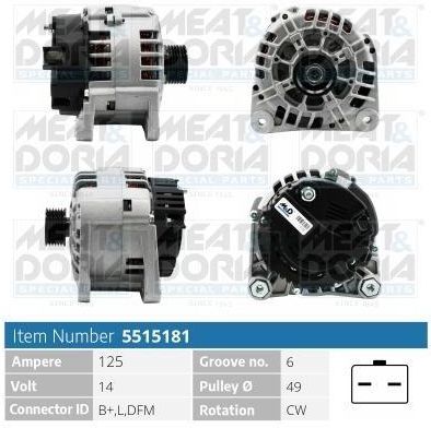 Alternator (14v, 125a) pasuje do: nissan interstar, primastar, opel movano a, vivaro a, renault avantime, clio ii, espace iii, laguna ii, master ii, trafic ii, vel satis 1.2-3.0d 07.00-. Napięcie [V]: 14 Prąd ładowania alternatora [A]: 125 Odstęp pomiędzy kołem pasowym i alternatorem [mm]: 42 ID wykonania wtyczki: B+,L,DFM Liczba otworów do mocowania: 2 Liczba rowków: 6 Koła pasowe: z kołem pasowym wielorowkowym Ø koła pasowego [mm]: 49 Kierunek obrotów: zgodnie z ruchem wskazówek zegara