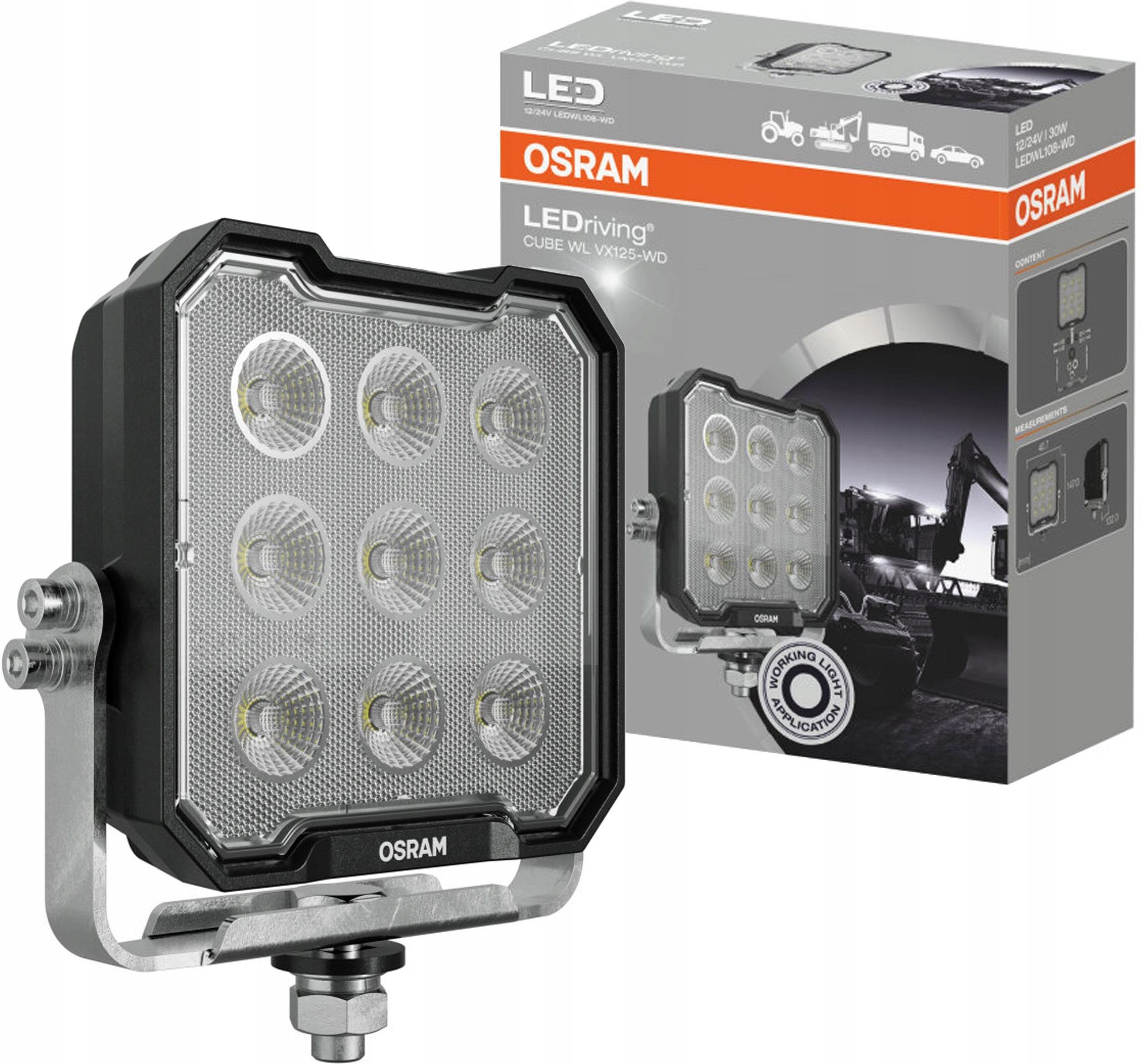 Osram Cube WL VX125-WD LEDWL108-WD Mocne światła robocze LED Dzięki OSRAM LEDriving Cube WL VX125-WD uzyskasz imponujące oświetlenie na ciemnych polach i leśnych ścieżkach, w terenie i na uboczu. Lampa robocza łączy przystępność cenową z wyjątkową wydajnością, jakością i funkcjonalnością, zapewniając użytkownikom imponującą widoczność w miejscach pracy poza drogami i terenami terenowymi. Zaprojektowana z myślą o różnorodnych zadaniach lampa robocza zachwyca strumieniem świetlnym aż do 3000lm oraz szerokim rozsyłem strumienia światła o szerokim rozsyle światła, znacznie zwiększając bezpieczeństwo pracy Twoje i innych. Nawet przy słabym oświetleniu i ograniczonej widoczności światło robocze o temperaturze do 6000 kelwinów może zapewnić warunki podobne do światła dziennego. Ma wszechstronne zastosowanie, jest odporny na liczne wpływy środowiska, a dzięki wysokiej jakości materiałom, takim jak aluminiowa obudowa i stabilna soczewka z poliwęglanu, jest szczególnie lekki, a jednocześnie wytrzymały i odporny. LEDriving Cube WL VX125-WD został przetestowany i zatwierdzony dla klas ochrony IP IP6K8 i IP6K9K w naszym laboratorium symulacji środowiska z certyfikatem DIN pod kątem ekstremalnych wpływów zewnętrznych, takich jak woda, kurz, uderzenia, ciepło, zimno i ciągłe wibracje. Jest skutecznym i wydajnym dodatkiem do Twojego pojazdu i można go przymocować do samochodów ciężarowych, maszyn rolniczych, pojazdów użytkowych, pojazdów budowlanych i pojazdów terenowych. Szeroka wiązka Do wielkopowierzchniowego i szczególnie szerokiego rozsyłu światła. Klasy ochrony IP oraz IK Przetestowane i zatwierdzone w laboratorium symulacji środowiska z certyfikatem DIN pod kątem ekstremalnych wpływów zewnętrznych, takich jak woda, kurz, wstrząsy, uderzeia, ciepło, zimno, ciągłe wibracje i wiele innych. Wiązka o długości do 67m Zobacz i bądź widoczny dzięki firmie OSRAM. Wytrzymały i odporny na wibracje Zaprojektowane specjalnie do wymagających środowisk pracy.