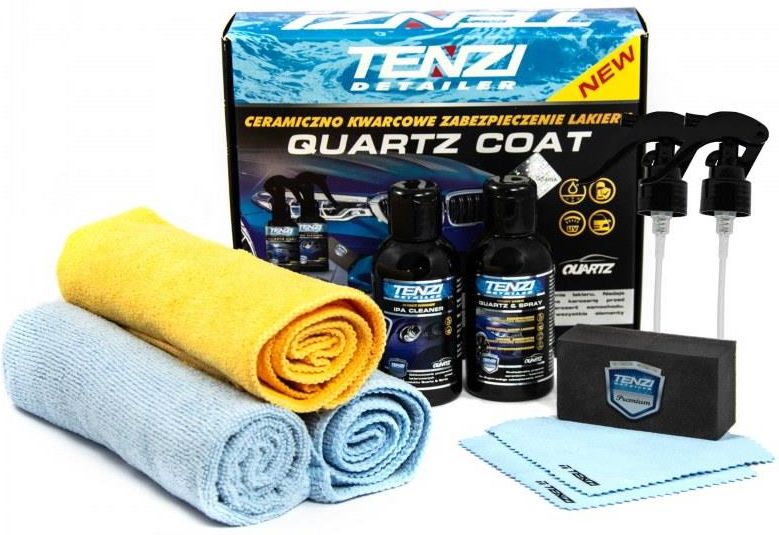 Tenzi Quartz Coat powłoka ceramiczna do lakieru Powłok ceramiczna Tenzi Quartz Coat Preparat zabezpiecza lakier przed kwaśnymi deszczami, słońcem i promieniowaniem UV, erozją pogodową, zanieczyszczeniami środowiskowymi, spadami z drzew, owadami zapewniając szybkie odprowadzenie wody i ochronę lakieru. Zapewnia doskonały połysk z jednoczesnym efektem skraplania wody oraz spowalnia osadzanie się brudu, rozprasza promienie słoneczne, ogranicza proces matowienia lakieru. Powłoka nadaje się również do nakładania na elementy metalowe, jak i plastikowe lakierowane. Produkt należy aplikować w zamkniętym pomieszczeniu, w temperaturze 18-26°C. Zabezpiecza wszystkie elementy lakierowane. Zalecana regeneracja powłoki co 6 miesięcy. Właściwości chroni lakier przed solą, korozją i uszkodzeniami mechanicznymi, które mogą powstać po uderzeniu kamienia efekt "samoczyszczenia" zapewnia mniejszy wysiłek podczas czyszczenia lakieru pozostawia niezwykle głęboki połysk i wydobywa intensywny połysk pozytywnie wpływa na zachowanie wartości pojazdu ponieważ przedłuża żywotność powierzchni lakieru Aplikacja powłoki optymalna temperatura, w której zalecane jest nakładanie powłoki to 18-22°C umytą i wysuszoną karoserię należy odtłuścić załączonym do zestwu preparatem nanieść preparat QUARTZ COAT na pierwszy element za pomocą spryskiwacza lub aplikatorem owiniętym w szmatkę dokładnie rozprowadzić produkt prostymi pociągnięciami aplikatora wzdłuż i w poprzek pozostawić do wyschnięcia na 3-7 minut delikatnie przepolerować szmatką z mikrofibry (bez dociskania) powtórzyć aplikację na kolejnych elementach karoserii. odczekać min. 3 h przed nałożeniem kolejnej warstwy po nałożeniu ostatniej warstwy pozostawić do utwardzenia w tych samych warunkach przez min 12 h Opakowanie Quqrtz Coat - 100 ml Ipa Cleaner - 100 ml 2 x szmatka z mikrofibry - 250 GSM 1 x szmatka z mikrofibry - 400 GSM 2 x spryskiwacze do aplikacji 1 x aplikator i 2 szmatki do aplikatora