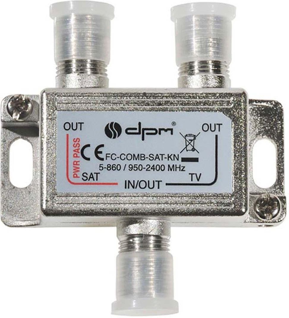 Sumator antenowy - DVB-T + SAT - BM FCCOMB Dane techniczne Model: Typ BMFCCOMB: SUMATOR Sumator antenowy służy do sumowania sygnału z dwóch anten DVB-T i SAT . Dzięki zastosowaniu sumatora można doprowadzić sygnał z anteny telewizji naziemnej i anteny telewizji satelitarnej jednym przewodem do domu. Urządzenie obsługuje anteny satelitarne z zasilaniem i anteny telewizji naziemnej pasywne (bez wzmacniacza). Podłączenie Przewód z anteny satelitarnej doprowadzamy do sumatora. Przewód z anteny telewizji naziemnej DVB-T doprowadzamy do sumatora. Jednym przewodem podłączamy się do sumatora i doprowadzamy sygnał do domu. Przewód z sumatora podłączamy do gniazda końcowego , który ponownie rozdziela sygnał DVB-T i SAT. Podłączamy przewody z gniazda końcowego do Telewizora (Tunera DVB-T) i Dekodera satelitarnego. Dzięki zastosowaniu sumatora marki DPM można bez problemu odbierać sygnał z dwóch różnych anten za pomocą jednego przewodu w instalacji domowej. Sumator BMFCCOMB został wykonany z najwyższej jakości materiałów co pokazuje obudowa wykonana z metalu i przyłącza typu F. Zakres pracy sumatora: TV: 5-790 MHz SAT: 950-2150 MHz