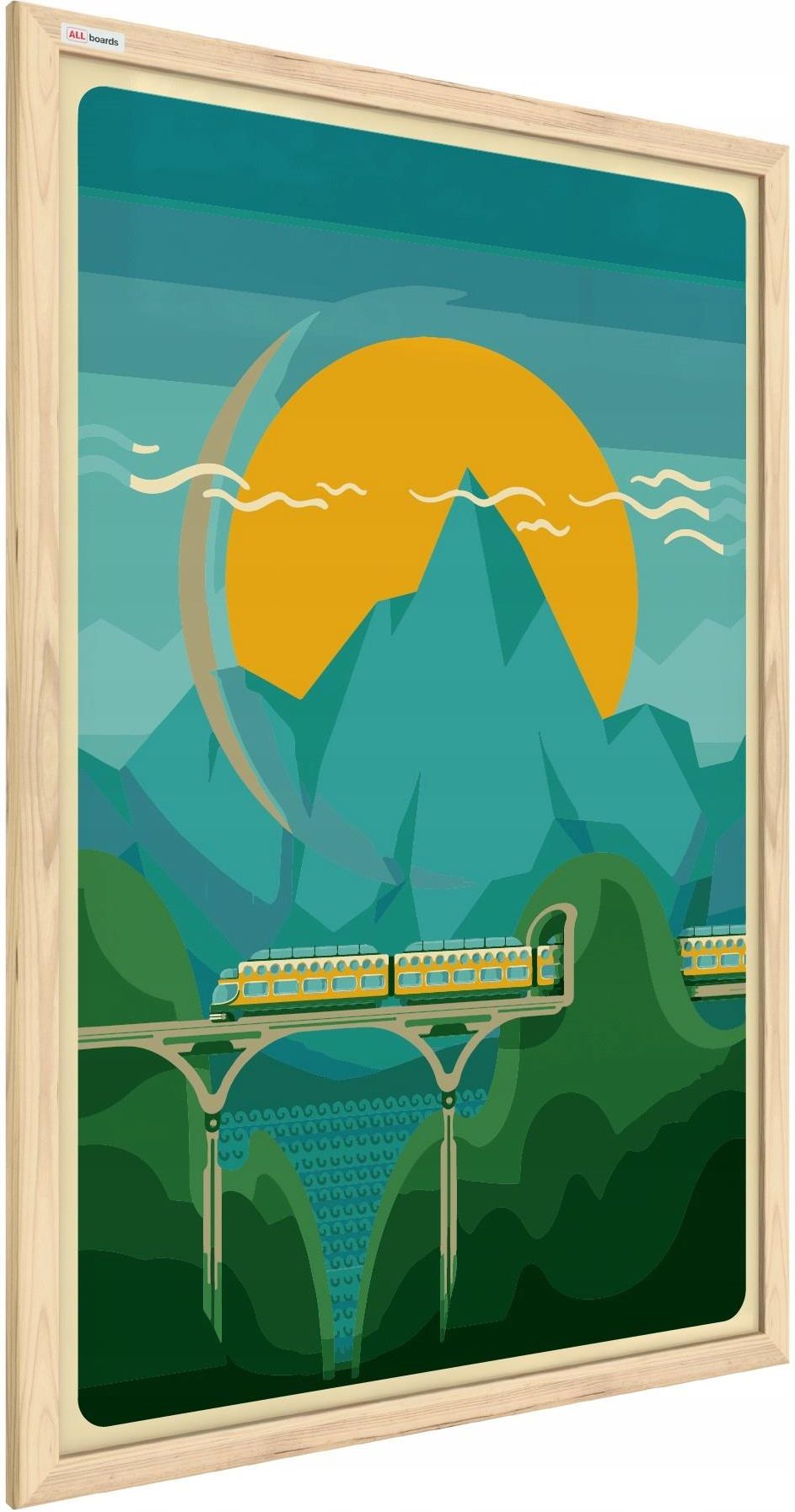 Obraz pociąg na tle gór 60x40cm w ramie drewnianej naturalnej Powierzchnia – kolorowa grafika nadrukowana na powierzchnię magnetyczną. Całość konstrukcji zamknięta jest w ramie drewnianej. Grafika - obraz przedstawia pociąg na tle krajobrazu gór oraz słońca. Wysoka jakość - wykorzystano …