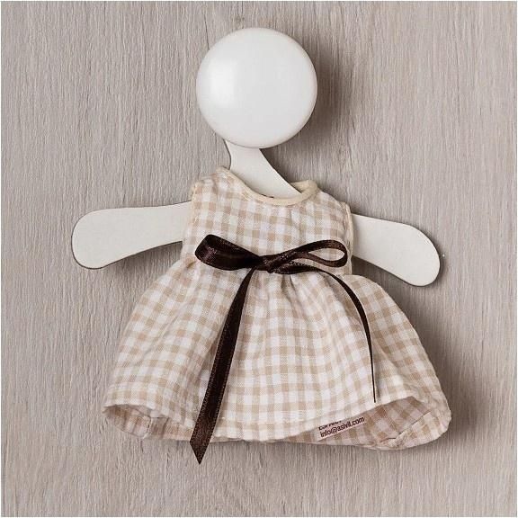 Ręcznie szyta, miękka, bawełniana sukienka w beżową krateczkę została zaprojektowana specjalnie dla lalek hiszpańskich z serii ASI Bomboncin. Kreację zdobi satynowa lśniąca kokardka. Wygodne zapięcie na rzep umożliwia łatwe zdjęcie i nałożenie ubranka. Outfit na kartonowym wieszaczku z logo marki ASI zapakowany jest w foliowe opakowanie. Wszystkie ubranka dla lalek marki ASI są w całości szyte w Hiszpanii.