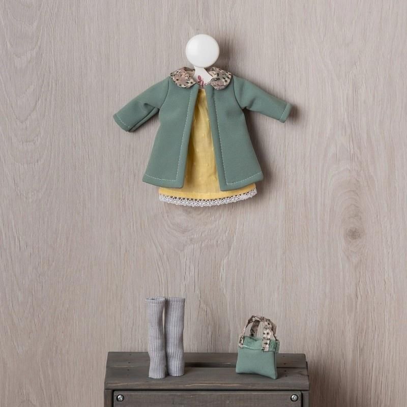 Ręcznie szyty, oryginalnie zaprojektowany outfit w modnych odcieniach koloru zielonego i żółtego został zaprojektowany specjalnie dla lalek hiszpańskich z serii ASI Celia. Elegancki płaszczyk z kołnierzykiem wspaniale prezentuje się w zestawie z żółtą bawełnianą sukienką wykończoną białą koronką oraz getrami. Całość dopełnia stylowa torebka. Outfit na kartonowym wieszaczku z logo marki ASI zapakowany jest w foliowe opakowanie. Uzupełnij kolekcję ubranek lalek hiszpańskich i uatrakcyjnij dziecku zabawę! Wszystkie ubranka dla lalek marki ASI są w całości szyte w Hiszpanii. EAN: 8435384461154