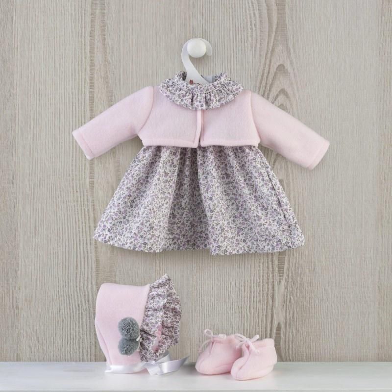 Urocza bawełniana, rozkloszowana sukieneczka z kołnierzykiem w delikatne kwiatuszki została zaprojektowana specjalnie dla lalek hiszpańskich z serii Leo o wysokości 46 cm. W komplecie jasnoróżowe polarowe bolerko, wiązana satynową tasiemką czapeczka wykończona falbanką oraz miękkie buciki. Wygodne …