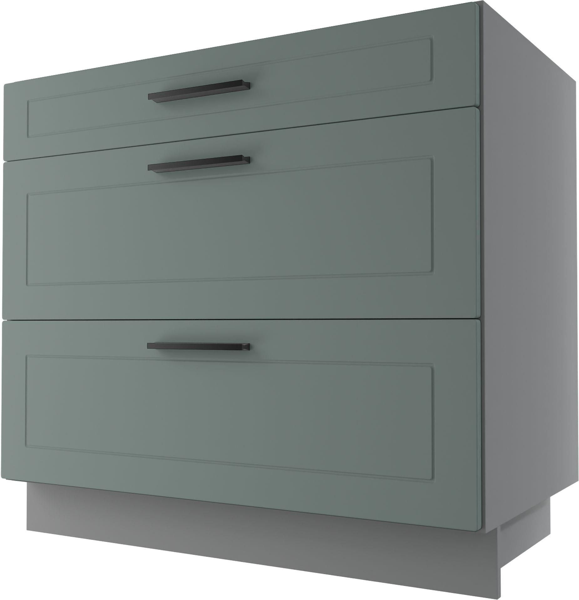 BERGAMO SZAFKA DOLNA D3E/90 HETTICH MIĘTOWY MAT to szafka dolna do kuchni wyposażona w potrójne szuflady na prowadnicach Hettich zapewniających ciche domknięcie oraz wygodne użytkowanie. Prezentowane meble kuchenne miętowe wyróżniają się matowym wykończeniem powierzchni oraz dekoracyjnym frezowaniem. Fronty zastosowane w kolekcji kuchni Komfort powstały z foliowanej jednostronnie płyty MDF, która zapewnia łatwość utrzymania nieskazitelnej czystości oraz odporność na uszkodzenia mechaniczne w postaci przebarwień, pęknięć oraz zarysowań.