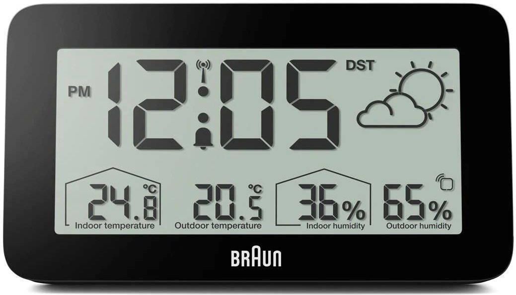 Braun Bc13bp-Rc Elektroniczna stacja pogody z budzikiem, termometrem, higrometrem i sondą zewnętrzną alarm, budzik, drzemka, czytelny podświetlany wyświetlacz, wbudowany czujnik zmroku, zegar sterowany radiowo - DCF77, sam się ustawia. Budzik Braun BC13BP-DCF, składa się z dwóch części, pierwszą …