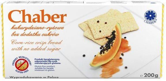 CHABER Pieczywo chrupkie kukurydziano ryżowe 200 g Możliwość zakupu w opakowaniu zbiorczym: 12 sztuk. Cechy: produkt bezglutenowy, odpowiedni dla osób nietolerujących glutenu. Bez substancji konserwującychInformacje dla alergików:Nie zawiera zbóż zawierających gluten.Składniki:kaszka kukurydziana 89%, mąka ryżowa 11%, sólWartość odżywcza: W 100 g produktu: wartość energetyczna (energia): 1535 kJ / 362 kcal,tłuszcz 1,2g w tym kwasy tłuszczowe nasycone 0,4g,węglowodany 78g w tym cukry 1,0g,błonnik 2,5g,białko 8,5g, sól 0,30g. Opakowanie zawiera przeciętnie 7 porcji produktu. Opakowanie zawiera przeciętnie 7 porcji produktu. Przechowywanie:Przechowywać w suchym miejscu.Przechowywać w temperaturze otoczenia.Kraj produkcji:PolskaDane producenta:Chaber S.A. al. Prymasa Tysiąclecia 83 01-242 Warszawa Zakład Produkcyjny: Odrzywołek 28b 05-622 Belsk Duży PolskaAdres zwrotny:Chaber S.A. al. Prymasa Tysiąclecia 83 01-242 Warszawa www.chaber.com.pl