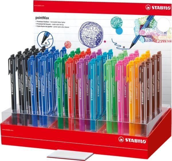 STABILO pointMax - nowa odsłona kultowego już cienkopisu STABILO. Cienkopis posiada obudowę w kolorze tuszu z charakterystycznymi dla STABILO jasnymi pasami, praktyczny klips i nylonową końcówka o grubości 0,8 mm idealną do pisania, rysowania, szkicowania i podkreślania. Stworzony z myślą o uczniach i studentach oraz tych którzy dużo piszą. Idealny do tworzenia map myśli i kolorowych notatek ułatwiających zapamiętywanie. Cienkopis dostępny jest w 24 intensywnych kolorach. Kartonowy display zawierający 48 szt. w 10 kolorach.