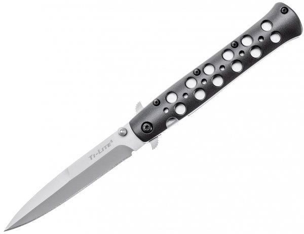 Nóż składany Cold Steel Ti-Lite 4" CPM-S35VN (CS-26B4) Typ noża: Składany Styl: Militarno-taktyczny Długość głowni: 152 mm Grubość głowni: 4 mm Profil głowni: Inne Rodzaj ostrza: Ząbkowane Gatunek stali: AUS10A Odporność na stępienie: Dobra Odporność na korozję: Bardzo dobra Sposób otwierania: …