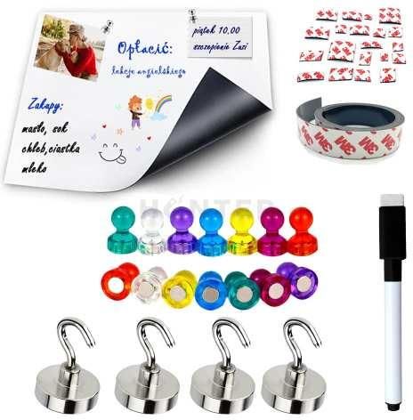 ZESTAW: MAGNESY NA LODÓWKĘ - TABLICA ŚCIERALNA - HACZYKI - TAŚMA MAGNETYCZNA SAMOPRZYLEPNA - MARKER NAJWAŻNIEJSZE WŁAŚCIWOŚCI W skład zestawu wchodzi: * 4 uchwyty neodymowe z haczykiem 16x5 mm magnes 16 KG * taśma magnetyczna samoprzylepna 3M szerokość 25 mm długość 1 m * Tablica na lodówkę …