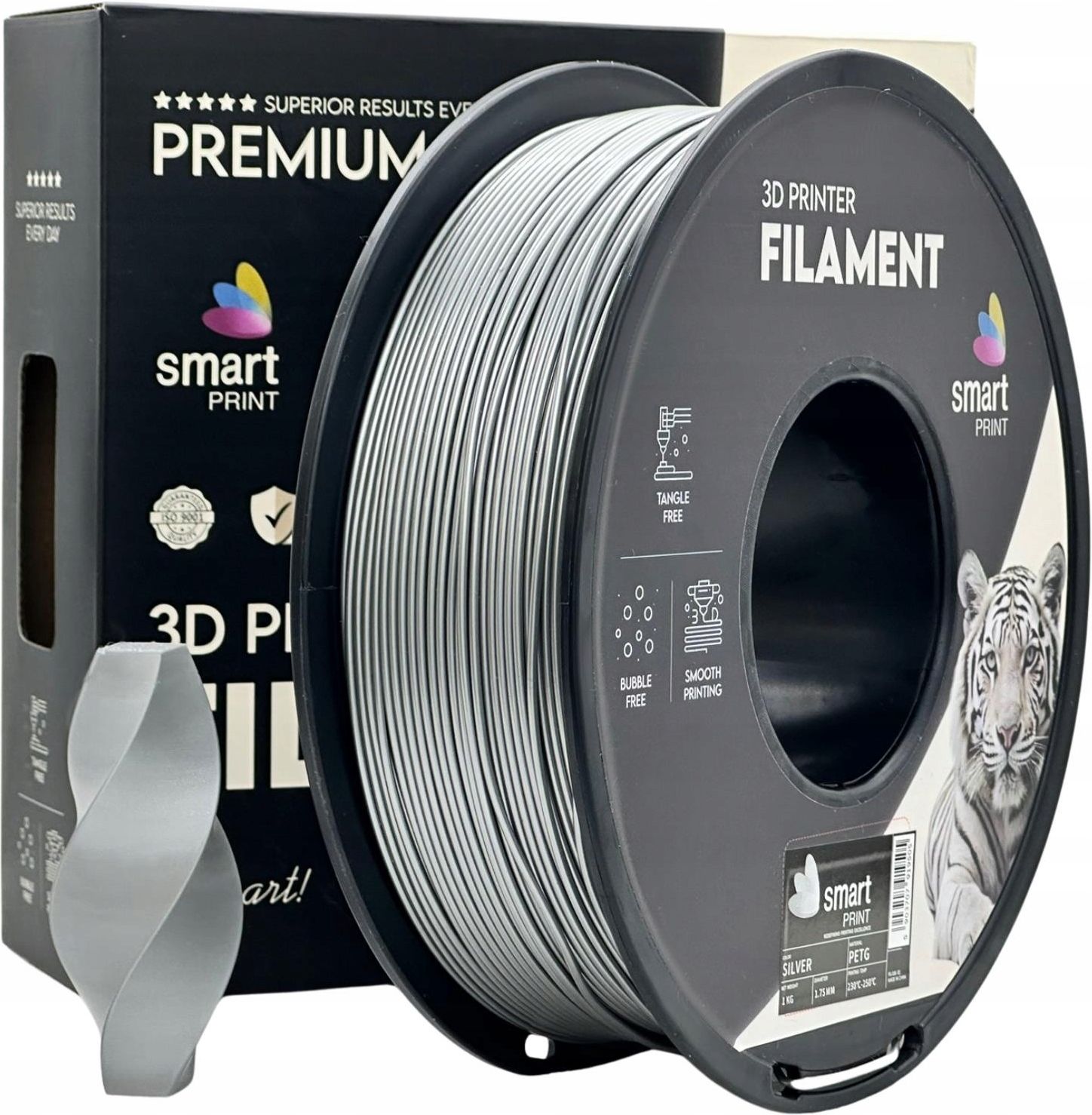 Filament PETG SREBRNY 1,75 mm – 1 kg |SMART PRINT Czarny filament premium PETG od SMART PRINT to solidny wybór dla każdego, kto szuka materiału odpornego, estetycznego i niezawodnego. Doskonale sprawdza się w codziennych i zaawansowanych projektach technicznych, użytkowych i dekoracyjnych. Specyfikacja techniczna Średnica: 1,75 mm (±0,02 mm) Waga netto: 1 kg Kolor: SREBRNY (SILVER) Materiał: PETG (kopoliester o podwyższonej wytrzymałości) Temperatura druku: 220–250°C Temperatura stołu: 70–90°C Główne zalety ⚫ Trwałość i odporność – mocne, odporne na uderzenia i chemikalia wydruki � Wysoka jakość druku – niskie ryzyko wypaczeń, doskonała adhezja warstw � Uniwersalna kompatybilność – działa z większością drukarek FDM/FFF Bezwonny i bezpieczny – odpowiedni do pracy w domu, szkole i biurze Gotowy do użycia – pakowany próżniowo z pochłaniaczem wilgoci Zastosowanie Obudowy, uchwyty i części konstrukcyjne Modele techniczne i funkcjonalne � Dekoracje, projekty prezentacyjne � Produkcja jednostkowa i małoseryjna FAQ – Najczęściej zadawane pytania Czy filament PETG pasuje do mojej drukarki 3D? Tak – jest kompatybilny z większością drukarek FDM/FFF obsługujących średnicę 1,75 mm. Jakie są zalecane ustawienia druku? Dysza: 220–250°C Stół: 70–90°C Chłodzenie: częściowe lub wyłączone, w zależności od modelu Czy PETG jest trudniejszy w druku niż PLA? Minimalnie – wymaga wyższej temperatury, ale oferuje większą trwałość, odporność na wilgoć i mniejszą kruchość. Jak pakowany jest filament? Na szpuli 1 kg, szczelnie zapakowany próżniowo z pochłaniaczem wilgoci. Czy ten filament nadaje się do części technicznych? Zdecydowanie – PETG Professional Lab cechuje się wysoką wytrzymałością mechaniczną i odpornością na czynniki zewnętrzne Specyfikacja Średnica filamentu: 1,75 mm (tolerancja: ±0,03 mm) Waga: 1 kg Rozmiar szpuli: fi 195 mm, otwór piasty 75 mm Temperatura dyszy: 220°C – 240°C Temperatura podgrzewanego stołu: 80°C – 90°C Kompatybilność – filament pasuje do drukarek FDM/FFF marek: Bambu Lab (np. P1P, P1S, X1C z AMS) Creality (Ender 3 / V2 / 5 / CR-10 / K1) Anycubic (Kobra, Mega S, i3 Mega) Prusa (i3 MK3, MK4, Mini) Artillery (Sidewinder X1, Genius) Elegoo (Neptune 2/3/4) Flashforge (Adventurer 3/4, Creator Pro z głowicą 1,75 mm) Qidi Tech (X-Plus, X-Max, i-Fast) Voron (custom DIY z ekstruderem 1,75 mm) Snapmaker (A350/A250 z modułem FDM) Skriware (Skriware 2)