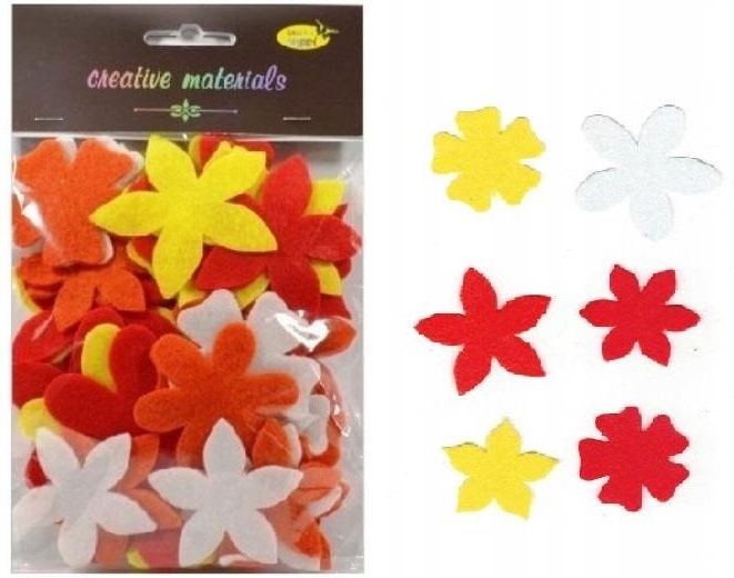 Filcowe Kwiatki w odcieniach ciepłych 60szt. Elementy kwiatowe z filcu miks 60 elementów 48-65 mm w odcieniach ciepłych, białym żółtym, czerwonym, pomarańczowym . Zestawy elementów z dość grubego filcu 1.5 mm składające się z 60 elementów w kształcie płatków kwiatowych różnych wzorów bez dziurki w środku płatka. Opakowane zawiera tonacje kolorystyczne. Wielkości elementów 48 - 65 mm umożlwiają tworzenie kolorowych kompozycji kwiatowych. Opakowanie posiada elegancką brązową zawieszkę z eurodziurką. Cena za opakowanie zawierające 60 elementów. Producent: Galeria Hobby [Kod oferty: S00185834A, 5900950538910, 23.11.2022, 08:38MM]