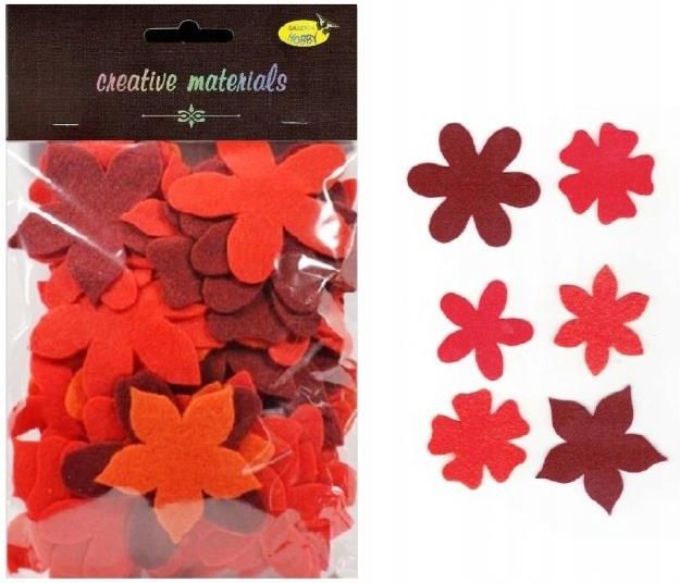 Filcowe Kwiatki tonacja pomarań-czerwona 60szt Elementy kwiatowe z filcu miks 60 elementów 48-65 mm w odcieniach pomarańczowo-czerwonym. Zestawy elementów z dość grubego filcu 1.5 mm składające się z 60 elementów w kształcie płatków kwiatowych różnych wzorów bez dziurki w środku płatka. Opakowane zawiera 4 tonacje kolorystyczne. Wielkości elementów 48 - 65 mm umożlwiają tworzenie kolorowych kompozycji kwiatowych. Opakowanie posiada elegancką brązową zawieszkę z eurodziurką. Cena za opakowanie zawierające 60 elementów. Producent: Galeria Hobby [Kod oferty: S00185836A, 5902581171832, 23.11.2022, 08:38MM]