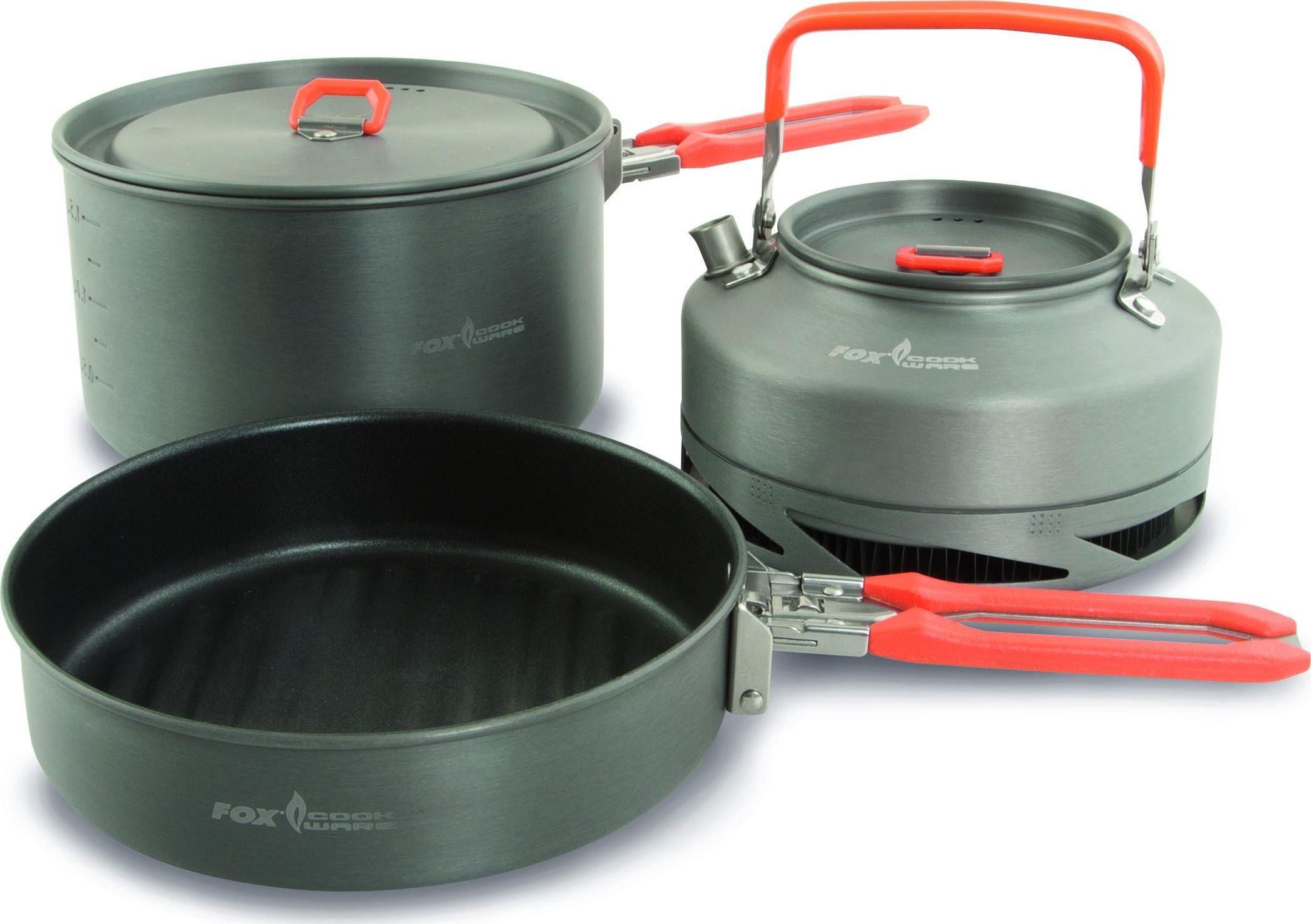Garnek Patelnia Czajnik Zestaw Turystyczny Wędkarski Fox Cookware Set 3 Med Producent: Fox, Symbol: CCW001 Zestaw Naczyń Fox Cookware Set 3 Medium 3-częściowy zestaw naczyń kuchennych składający się z patelni, średniego garnka oraz czajnika o pojemności 0.9l. Pogrubiono aluminiowe ścianki garnka …