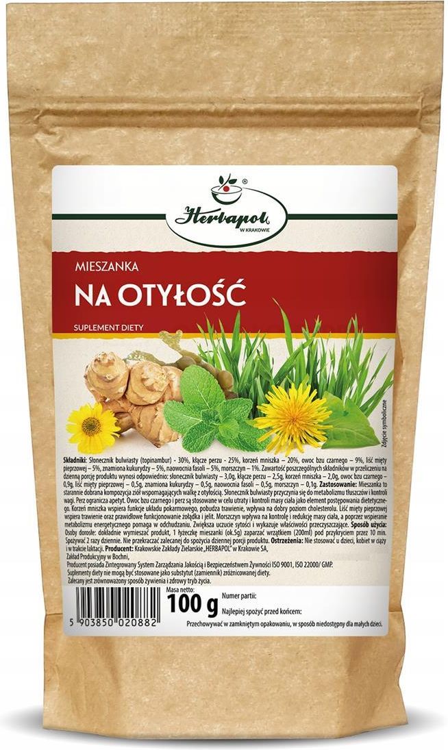 Mieszanka NA OTYŁOŚĆ Herbatka ziołowa | Suplement diety Masa netto: 100 g Składniki Słonecznik bulwiasty (topinambur) - 30%, kłącze perzu - 25%, korzeń mniszka – 20%, owoc bzu czarnego – 9%, liść mięty pieprzowej – 5%, znamiona kukurydzy – 5%, naowocnia fasoli – 5%, morszczyn – 1%. Zawartość poszczególnych składników w przeliczeniu na dzienną porcję produktu wynosi odpowiednio: słonecznik bulwiasty – 3,0g, kłącze perzu – 2,5g, korzeń mniszka – 2,0g, owoc bzu czarnego – 0,9g, liść mięty pieprzowej – 0,5g, znamiona kukurydzy – 0,5g, naowocnia fasoli – 0,5g, morszczyn – 0,1g. Zastosowanie Mieszanka to starannie dobrana kompozycja ziół wspomagających walkę z otyłością. Słonecznik bulwiasty przyczynia się do metabolizmu tłuszczów i kontroli wagi. Perz ogranicza apetyt. Owoc bzu czarnego i perz są stosowane w celu utraty i kontroli masy ciała jako element postępowania dietetycznego. Korzeń mniszka wspiera funkcje układu pokarmowego, pobudza trawienie, wpływa na dobry poziom cholesterolu. Liść mięty pieprzowej wspiera trawienie oraz prawidłowe funkcjonowanie żołądka i jelit. Morszczyn wpływa na kontrolę i redukcję masy ciała, a poprzez wspieranie metabolizmu energetycznego pomaga w odchudzaniu. Zwiększa uczucie sytości i wykazuje właściwości przeczyszczające. Sposób użycia Osoby dorosłe: dokładnie wymieszać produkt, 1 łyżeczkę mieszanki (ok.5g) zaparzać wrzątkiem (200ml) pod przykryciem przez 10 min. Spożywać 2 razy dziennie. Nie przekraczać zalecanej do spożycia dziennej porcji produktu. Przechowywać w zamkniętym opakowaniu, w sposób niedostępny dla małych dzieci. Ostrzeżenia Nie stosować u dzieci, kobiet w ciąży i w trakcie laktacji. Informacje dodatkowe Stawka VAT: 8% GTIN/EAN: 5903850020882 Suplementy diety nie mogą być stosowane jako substytut (zamiennik) zróżnicowanej diety. Zalecany jest zrównoważony sposób żywienia i zdrowy tryb życia. Producent posiada Zintegrowany System Zarządzania Jakością i Bezpieczeństwem Żywności ISO 9001, ISO 22000/GMP. Zalecany jest zrównoważony sposób żywienia i zdrowy tryb życia. Producent: Herbapol w Krakowie SA .................................................................................................................. Jakość naszych wyrobów jest potwierdzona uzyskanymi certyfikatami - Firma posiada: Zintegrowany System Zarządzania Jakością i Bezpieczeństwem Żywności ISO 9001, ISO 22000/HACCP/GMP ..................................................................................................................
