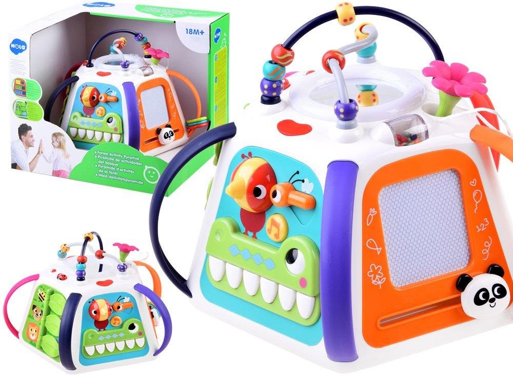 Nowa odsłona słynnej multikostki Hola, to propozycja dla dzieci od 18 m-ca życia. Interaktywna zabawka z pięcioma płaszczyznami do ciekawych, edukacyjnych zabaw oraz górą z labiryntem, kolorowymi koralikami do ćwiczenia małych rączek. Atrakcje zabawki: - włącznik on/off uruchamia wesołą melodię, odgłosy zwierząt oraz kolorowy efekt świetlny - lustereczko zachęca do zaglądania - kolorowe koraliki pozwolą na przesuwanie ich - płaszczyzna ze znikopisem - dziecko za pomocą rysika z kwiatuszkiem może rysować na tablicy swoje pierwsze rysuneczki, a następnie za pomocą misia pandy mazać je - płaszczyzna ruchoma animacja - obrazki, które dają złudzenie optyczne ruchomego wzoru, w momencie gdy dziecko przesunie kwadracik będzie widział ruchomą animację - płaszczyzna kołowrotki - kręcąc korbka maluszek wprawi w ruch trzy zębatki na, których namalowane zostały zwierzątka lew, motylek, rybka - płaszczyzna interaktywne drzewo z listkami - na obrazku znajdują się zwierzątka przykryte listkami, w momencie gdy dziecko je odsłoni usłyszy odgłos danego zwierzątka. Ptaszek - ćwierka, kotek - miauczy, słonik - wydaje odgłos trąbą, pszczółka - bzyczy, piesek - szczeka, lew - wydaje lwi odgłos. Wszystkie odgłosy zwierząt są wykańczane wesołą melodyjką z efektem świetlnym - płaszczyzna pianinko z krokodylem - klawisze pianinka usytuowane jako zęby krokodyla wygrywają gamę, poruszanie dziobem ptaszka, dziecko usłyszy radosne ćwierkotanie, motylek też wydaje odgłosy, przycisk z nutka wprawia multikostkę w wesołe granie z kolorowymi, efektami świetlnymi Dzięki tej zabawce dziecko będzie mogło poćwiczyć: - zdolności manualno - ruchowe - rozróżnianie kształtów - kolorów - dźwięków, odgłosów Wymiar zabawki: - 25 x 25 x 25 cm - zasilanie 3 x 1,5 V AA (brak w zestawie) Zabawka edukacyjna cały czas zachęca do zabawy, zaczepia maluszka. Jest to kostka, która dosłownie rośnie z dzieckiem. Atrakcyjność kolorów, kształtów cały czas zachęca i pobudza dziecko do działania, zabawy, odkrywania, uczenia się czegoś nowego. Sklep Jokomisiada oferuje szereg zabawek z serii Hola, które dzieci uwielbiają. Zestaw zapakowany w efektowne opakowanie, które świetnie nada się na prezent.