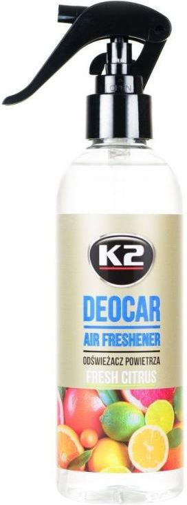 Wyjątkowy, uniwersalny odświeżacz powietrza o bardzo intensywnym aromacie, do stosowania we wnętrzu samochodu lub innych pomieszczeniach. Specjalnie dobrany zestaw nut zapachowych zapewnia wytchnienie i ukojenie dla zmysłów, wprowadzając do otoczenia powiew świeżości i długotrwale wypełniając je aromatyczną wonią. Odświeżacz powietrza z atomizerem K2 Deocar jest wyjątkowo wydajny. Dzięki zastosowaniu nowoczesnego aplikatora odświeżacz zrasza otoczenie delikatną mgiełką, która skutecznie wypełnia cudownym aromatem całą przestrzeń. Butelka 250ml wystarcza na ponad 700 aplikacji. Szczegółowo wyselekcjonowane, intensywne kompozycje zapewniają długotrwałe utrzymanie się zapachu w pomieszczeniu. Starannie dobrana receptura odświeżacza neutralizuje nieprzyjemne zapachy i wypełnia wnętrze aromatyczną wonią. Doskonale nadaje się do stosowania jako zapach samochodowy, a także w mieszkaniach, w biurach, łazienkach i toaletach, szafach, garderobach i wszelkich pozostałych miejscach, gdzie zależy nam na przyjemnym, odświeżającym zapachu. Zapach: Ożywcza i orzeźwiająca kompozycja Fresh Citrus, to połączenie świeżości egzotycznych owoców z delikatną nutą bawełny. Zapewnia przyjemny, domowy i odprężający aromat, podtrzymujący w otoczeniu klimat lata, pełen ciepła i przytulności.