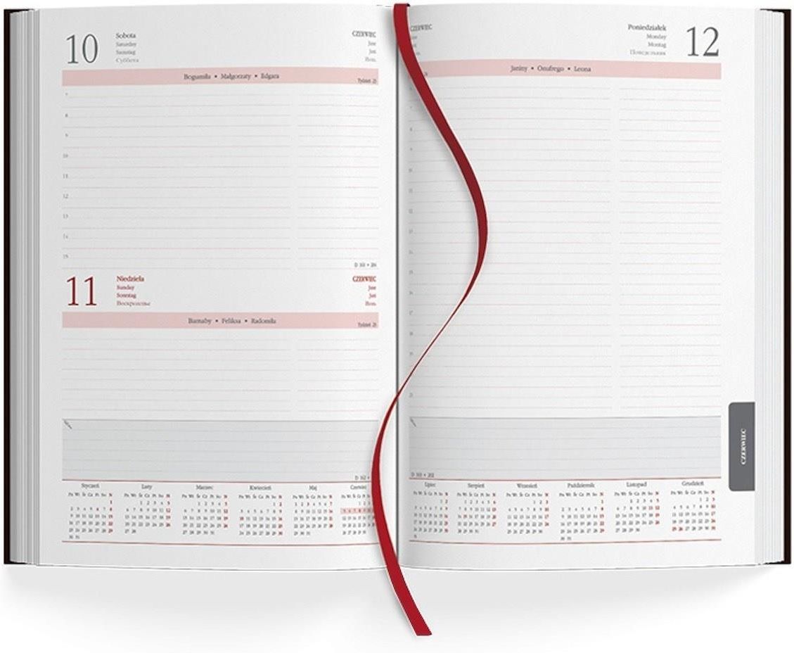 Format: B5 - 16,5 23,5 cm, 368 stron Układ: 1 dzień na stronie, registry nadrukowane Druk, papier: 2 kolory, papier 80 g/m2 w kolorze białym Kalendarium: w języku polskim, angielskim, niemieckim, hiszpańskim, numeracja dni i tygodni, potrójne imieniny, perforacja narożników Część informacyjna: plan kwartalny, strefy czasowe, alfabetyczny wykaz imion, skrócone kalendarium na rok 2025, 2026, 2027, 8 kolorowych map głównych miast w Polsce, drogowa mapa Polski, administracyjna mapa Europy