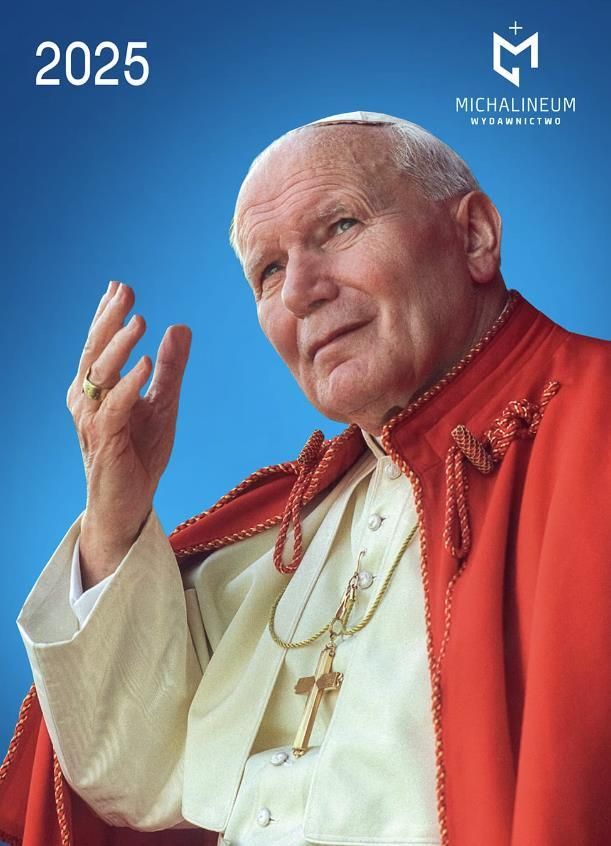Kalendarz ścienny na rok 2024 z fotografiami św. Jana Pawła II. Duża przejrzystość każdego miesiąca, z codziennym wykazem imienin oraz uroczystości i świąt kościelnych.