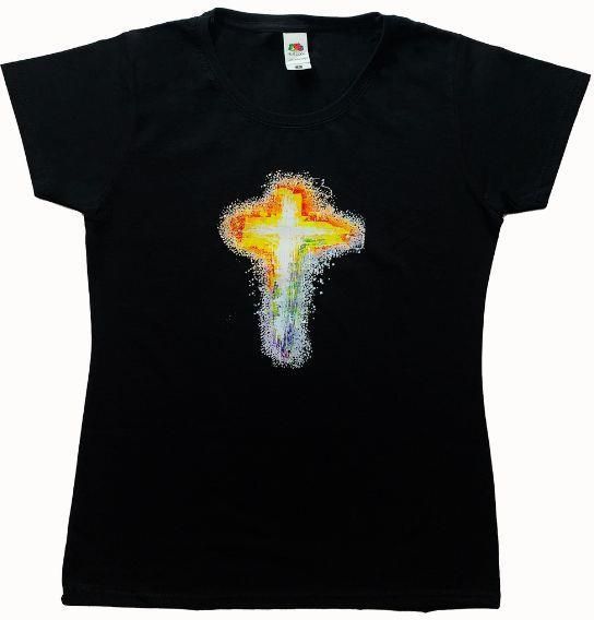 Koszulka czarna z grafiką krzyża full kolor. Gramatura materiału 180g/m2. Skład: 100% bawełna, ściągacz przy szyi: bawełna z dodatkiem lycry. Metoda wykonania nadruku: sitodruk. Można prać w pralkach automatycznych zgodnie z instrukcją na metce.