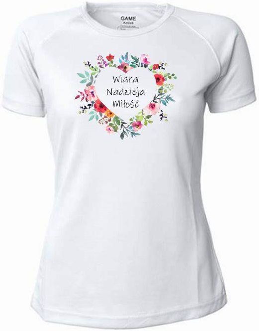 Koszulka w kolorze białym z napisem: Wiara, nadzieja, miłość . Grafika: serce z kwiatów. Gramatura materiału: 180 g/m2. Skład: 100% bawełna, ściągacz przy szyi: bawełna z dodatkiem lycry. Metoda wykonania nadruku: sitodruk. Można prać w pralkach automatycznych zgodnie z instrukcją na metce.
