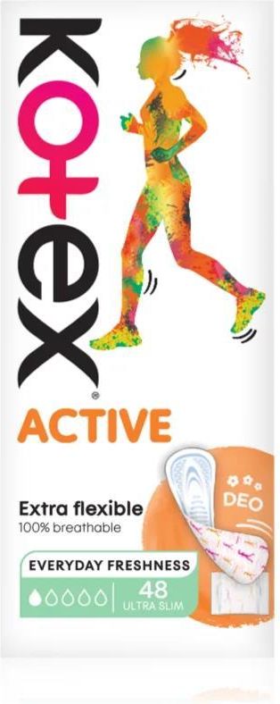 Kotex Active Deo, 48 szt., Wkładki żelowe dla kobiet, Maksymalna wygoda i 100% pewnej ochrony podczas miesiączki. Podpaski higieniczne Kotex Active Deo zapewni ci komfort i pewność w te dni. Właściwości: przyjemny miękki materiał pozostaje bezpiecznie na miejscu nawet przy ruchu idealnie pasują i dobrze utrzymują kształt rozmiar idealny na dni ze słabym krwawieniem lekko perfumowane