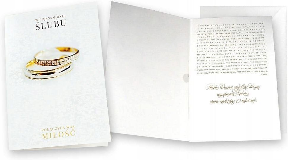 ŚLUBNA KOPERTA Kartka ŚLUBNA Na ŻYCZENIA Dla Młodych Karnet muzyczny Ślub Producent: Kukartka Kartki z serii Simfonica wyróżniają się nie tylko wielkością i pięknym wzorem, ale także niespodzianką w środku - po otwarciu kartki uruchamia się znane muzyczne nagranie "Ave Maria Jan Sebastian Bach. Wymiary karnetu po złożeniu: 15cm x 22,5 cm. Zdobiony w zależności od wzoru złotą folią lub cholograficzną. Każda kartka posiada życzenia w środku i kopertę. Dlaczego warto kupić tę kartkę okolicznościową Piękna oprawa dla Twoich życzeń Doda uroku każdemu podarunkowi Podkreśli każdą chwilę Wykonana z wysokiej jakości materiałów Idealnie sprawdzi się jako dodatek do prezentu Kartka jest doskonałym sposobem na przekazanie wyjątkowych życzeń Oferuje elegancję i styl, które sprawią, że Twoje życzenia zostaną w sercu na zawsze Kartka okolicznościowa to wspaniałe opakowanie Twoich najgłębszych uczuć i emocji To również świetny sposób, aby przekazać najserdeczniejsze życzenia i ciepłe słowa