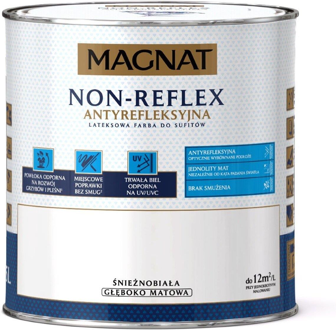 Kolor - biały | Pojemność - 2,5l | Wydajność - do 12m²/l MAGNAT Non-Reflex to biała, głęboko matowa farba do sufitów. Jej specjalna receptura umożliwia wykonywanie poprawek bez powstawania smug, a pochłaniająca świetlne refleksy powłoka optycznie wyrównuje pomalowane podłoże. Dzięki Farbie MAGNAT …