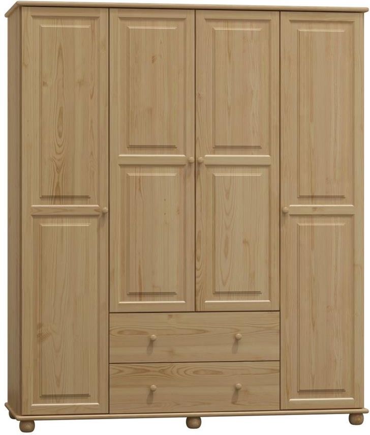 Szafa IV-Drzwiowa c76 160. Wykonana w całości z drewna sosnowego, plecy z płyty pilśniowej Zawiasy puszkowe. Szafa jest lakierowana lakierem bezbarwnym metodą natryskową. Wewnątrz szafy wieszak i półki. Dwie pakowne szuflady. Mebel wysyłany w paczce do samodzielnego montażu wraz z instrukcją oraz akcesoriami . Wymiary szafy : Szerokość 160 cm wysokość 190 cm głębokość 60 cm