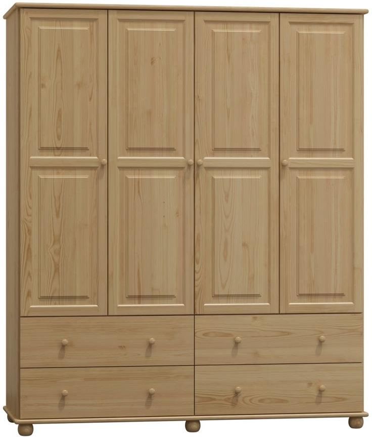 Szafa IV-Drzwiowa c79 160. Wykonana w całości z drewna sosnowego, plecy z płyty pilśniowej Zawiasy puszkowe. Szafa jest lakierowana lakierem bezbarwnym metodą natryskową. Wewnątrz szafy wieszak i półki. Cztery pakowne szuflady. Mebel wysyłany w paczce do samodzielnego montażu wraz z instrukcją oraz akcesoriami . Wymiary szafy : Szerokość 160 cm wysokość 190 cm głębokość 60 cm