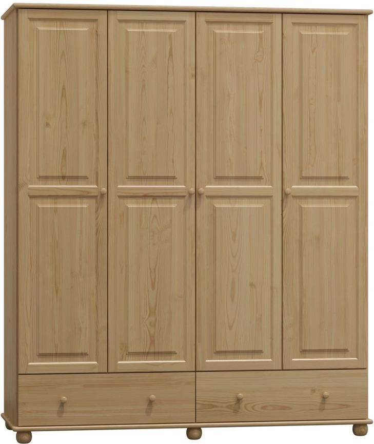 Szafa IV-Drzwiowa c80 160. Wykonana w całości z drewna sosnowego, plecy z płyty pilśniowej Zawiasy puszkowe. Szafa jest lakierowana lakierem bezbarwnym metodą natryskową. Wewnątrz szafy wieszak. Dwie pakowne szuflady. Mebel wysyłany w paczce do samodzielnego montażu wraz z instrukcją oraz akcesoriami . Wymiary szafy : Szerokość 160 cm wysokość 190 cm głębokość 60 cm