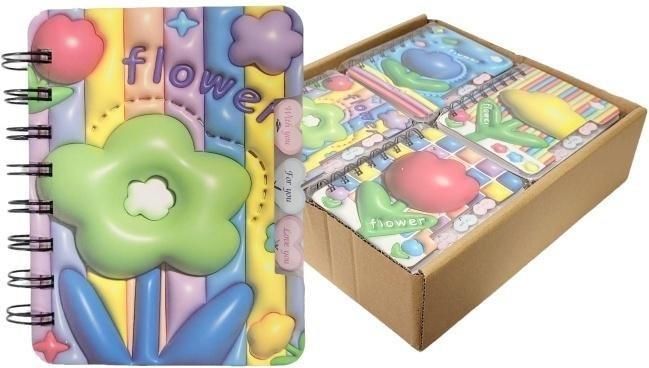 Uroczy notatnik A6 z fantazyjnymi, wypukłymi elementami w kształcie kwiatów i chmurek, utrzymany w pastelowej kolorystyce. Jest to doskonały wybór do robienia szybkich notatek, szkiców czy prowadzenia dziennika. Oprawa jest spiralna, co ułatwia wygodne przewracanie stron. Każdy notatnik ma na boku ozdobną tasiemkę z napisem "for you" i "love you". Notatniki sprzedawane są w opakowaniu zbiorczym zawierającym 20 sztuk, co sprawia, że są idealne zarówno do użytku indywidualnego, jak i jako upominki czy drobne podarunki. Podana cena w sklepie dotyczy jednej sztuki. MIX - wysyłka losowa