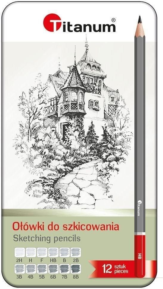 Ołówki do szkicowania Titanum - zestaw 12 sztuk Komplet ołówków składający się z 12 sztuk, dostarczany w eleganckim, metalowym pudełku. Ołówki prezentują różne stopnie twardości, co daje szerokie możliwości kreacji. W skład zestawu wchodzi ołówek o twardości: 2H,H,F,HB,B,2B,3B,4B,5B,6B,7B,8B. Wszystko to sprawia, że jest to idealny zestaw dla każdego, kto chce rozwijać swoje umiejętności szkicowania. EAN: 5907437687574