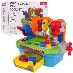 Opis Warsztat Dla Najmłodszych Multifunkcyjny, interaktywny warsztat dla maluszka od trzeciego roku życia, z efektami dźwięku i światła. Zabawka wykonana została z najlepszej jakości plastiku w żywych kolorach i jest całkowicie bezpieczna dla maluszka. Każdy element zestawu, został specjalnie przystosowany do rączek maluszka, a praktyczne uchwyty, umożliwiają łatwe uruchamianie. Na blacie warsztatu znajduje się piła tarczowa z efektami dźwięku charakterystycznego dla tego urządzenia i efektami światła, sorter kształtów i kolorów. Po boku warsztatu jest pokrętło, które podczas ruchu wydaje odgłosy. Nad blatem mamy półkę do zawieszenia narzędzi takich jak śrubokręt, klucz francuski i młotek. Tutaj znajduje się również ruchomy młot udarowy z efektem dźwięku i światła. Pod blatem warsztatu jest otwierana szufladka na klocuszki i narzędzia. Zabawka stymuluje zmysły maluszka i zachęca do aktywnej zabawy. Idealnie rozwija zdolności motoryczne i myślenia. Zabawka zasilana jest bateriami typu 3 x AG13 (baterie znajdują się w zestawie). Funkcje zestawu odpowiedni dla dzieci powyżej 3-go roku życia, w pełni bezpieczny i dostosowany kształtem i rozmiarem dla maluszków, wykonany z najlepszej jakości plastiku w żywych kolorach, bogato wyposażony, funkcje dźwiękowe: piła tarczowa, imadło, pokrętło, funkcje świetlne: piła tarczowa, młot udarowy. Wymiary warsztat ok. 27,5 cm x 20 cm x 14 cm, śrubokręt, klucz, młotek ok. 8 cm wysokości, klocuszki ok. 2,5 cm x 3,5 cm, opakowanie ok. 28,3 cm x 16,5 cm x 21 cm. Zawartość zestawu - warsztat z piłą tarczową, śrubokrętem, kluczem francuskim, młotem udarowym, pokrętłem, uchwytami na narzędzia, - 4 klocuszki w różnych kształtach i kolorach.