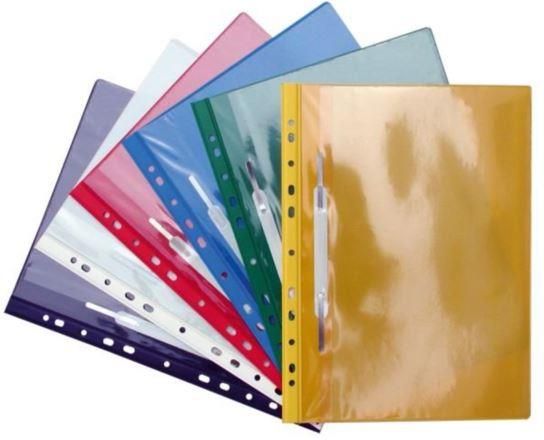 Skoroszyt plastikowy A4 zawieszkowy Panta Plast twardy. Wykonany ze sztywnego PCV, przednia okładka z wysokoprzeźroczystej sztywnej folii, tylna kolorowa. Posiada europerforację pozwalającą wpiąć go do każdego segregatora. Biały wymienny pasek do opisu skoroszytu. Pojemność do 200 kartek