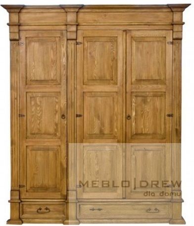 Woskowana szafa III-drzwiowa SAV-13 A1/A2 DUO Wymiary zewnętrzne: szerokość: 159 cm głębokość: 65 cm wysokość: 196 cm Kolor wosku: biały transparentny + wosk miodowy W kolekcji występuje prawie 60 modeli mebli, które łączy klasyczna forma wzornictwa lubianego dawniej w Skandynawii a obecnie w całej Europie. Filunki na frontach i bokach mebli eksponują rysunek słojów litego drewna sosnowego. Kolor bazowy kolekcji to wosk miodowy nanoszony jest on ręcznie. Wosk pszczeli uznawany jest za produkt ekologiczny. Zawiasy i uchwyty są ręcznie kute z żelaza, poddawane procesowi rdzewienia ich zadaniem jest podkreślenie prostoty oraz charakteru kolekcji. Meble rustykalne, postarzane. Wnętrze szafy stanowią dwa drążki na wieszaki jak również jedna półka na dole. Poniżej dwie duże funkcjonalne i pojemne szuflady bez prowadnic. Kolekcja w całości wykonywana jest z litego drewna sosnowego. Meble z tej kolekcji dostarczane są w całości, ich konstrukcja sprawia, że są stabilne, mocne i mogą służyć przez długie, długie lata.