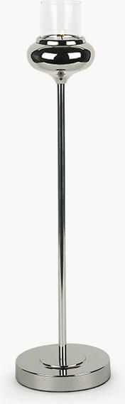Metalowy świecznik ze szklanym kloszem na wysokiej nóżce to prawdziwa uczta dla zmysłów i wyrafinowany dodatek, który przyciąga uwagę swą niebanalną formą i eleganckim wykończeniem. Jego srebrny, połyskujący kolor emanuje subtelnym blaskiem, odbijając światło i dodając wnętrzu nuty luksusu. Przejrzysta czarka, starannie osadzona na wysokiej, smukłej nodze, tworzy harmonijną kompozycję, w której każdy detal zachwyca precyzją i estetyką. Gdy w świeczniku zapłonie płomień, jego blask rozchodzi się wokół, tworząc ciepłą, przytulną atmosferę, idealną na wieczorne spotkania czy romantyczne chwile. Wysoka konstrukcja sprawia, że świecznik nie zajmuje wiele miejsca na stole, a jednocześnie stanowi efektowny akcent, który doskonale komponuje się z innymi elementami zastawy czy dekoracjami, podkreślając elegancję i styl aranżacji. Nie tylko na stole – jego uniwersalny design sprawia, że pięknie prezentuje się na komodach, półkach czy innych meblach, dodając wnętrzu odrobiny wyrafinowania. Pasuje zarówno do nowoczesnych, jak i glamour, jak i innych stylów, stanowiąc wszechstronny element dekoracyjny, który z pewnością przyciągnie wzrok i podkreśli charakter każdego pomieszczenia.